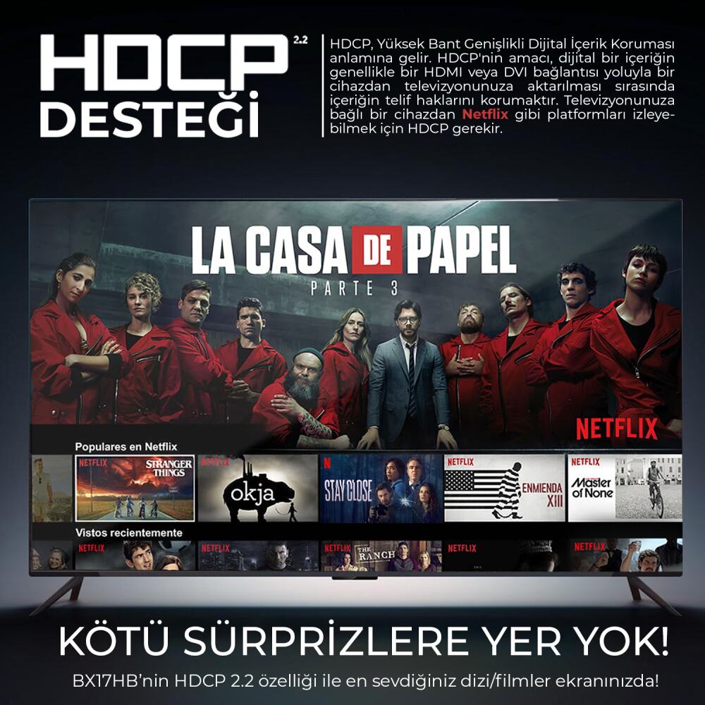 HDCP Yüksek Bant Genişlikli Dijital İçerik Koruması anlamına gelir. HDCP’nin amacı, dijital bir içeriğin genellikle bir HDMI veya DVI bağlantısı yoluyla bir cihazdan televizyonunuza aktarılması sırasında içeriğin telif haklarını korumaktır. Televizyonunuza bağlı bir cihazdan Netflix gibi platformları izleyebilmek için HDCP gerekir.