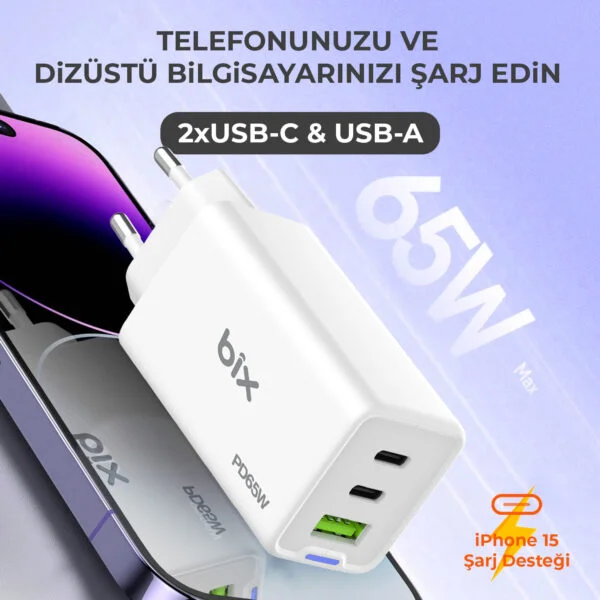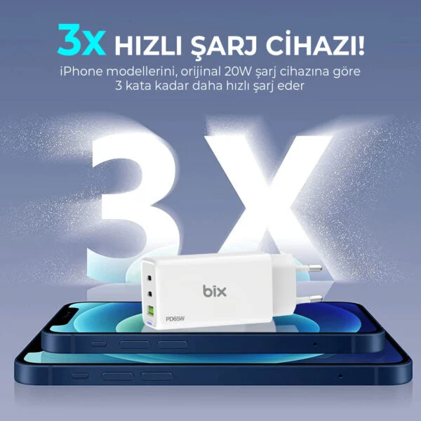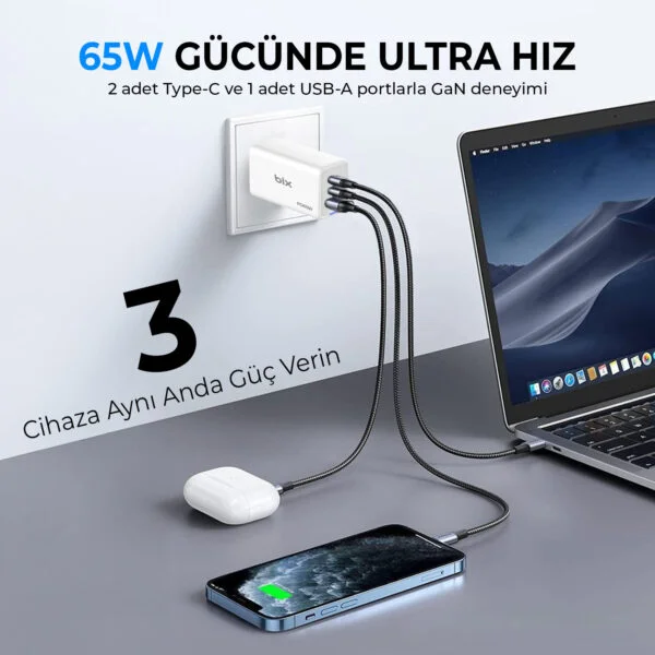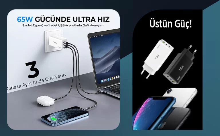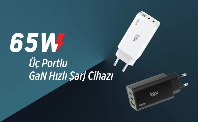 Bix BX3P66G GaN 65W 2*Type-C PD 3.0 ve USB-A QC Üç Portlu Hızlı Şarj Cihazı’nın üzerinde iki adet Type-C ve bir adet USB-A çıkış portu yer almaktadır. Tek port kullanıldığında Type-C portlar 65W ve 20W güç verirken, USB-A portu QC 18W’a kadar şarj desteklemektedir. 3 port aynı anda kullanıldığında ise toplamda 60W güç desteği sağlamaktadır. Böylece Macbook gibi PD şarjı destekleyen dizüstü bilgisayarlarınızı ve akıllı telefonlarınızı aynı anda şarj edebilirsiniz. Yapılan testlerde 13 inç Macbook’u 1.5 saatte %96 seviyelerine kadar şarj edebilmektedir. Hızlı şarj teknolojisinin yanında barındırdığı güvenlik protokolleri ile yüksek akım, düşük voltaj, yüksek sıcaklık ve kısa devre durumlarında şarjı keserek bağlı olan cihazları koruma altına alarak zarar görmesini engellemektedir. Üstün akıllı çipiyle akıllı telefon, tablet ve dizüstü bilgisayarlarınızı hızlı bir şekilde şarj etmenize olanak sağlar.
