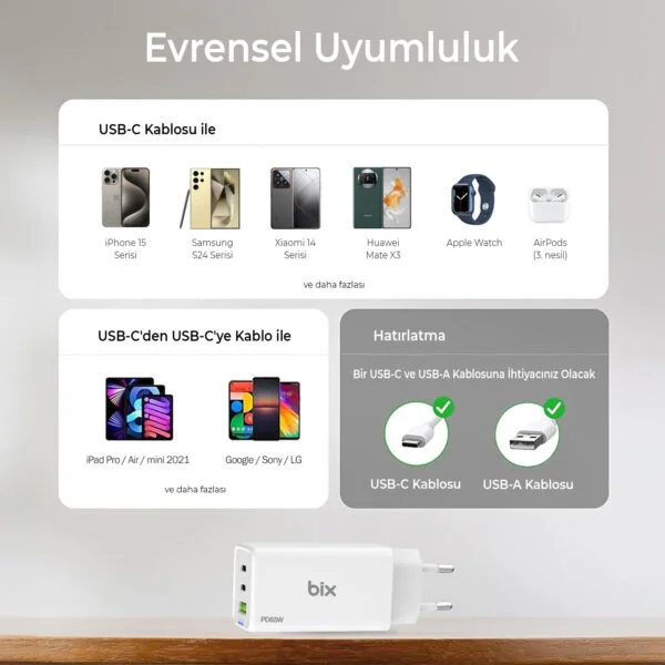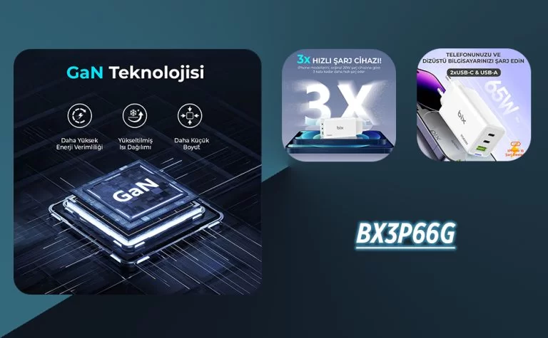 BX3P66G şarj cihazının çoklu koruma yöntemi sayesinde cihazlarınızı korumak amacıyla aşırı akım koruması, aşırı sıcaklık koruması ve şok devresi koruması ile donatılmıştır. Type-C çıkışından 65W’a kadar sağladığı yüksek güç ile başta iPhone 15 olmak üzere tüm Apple cep telefonları ve Apple kulaklık / Apple saat için aynı anda şarj etmek veya Samsung cep telefonu + Samsung kulaklık / Samsung saat için aynı anda şarj etmek için de uygundur. Type-C ve USB portları hızlı şarj teknolojilerine sahiptir.