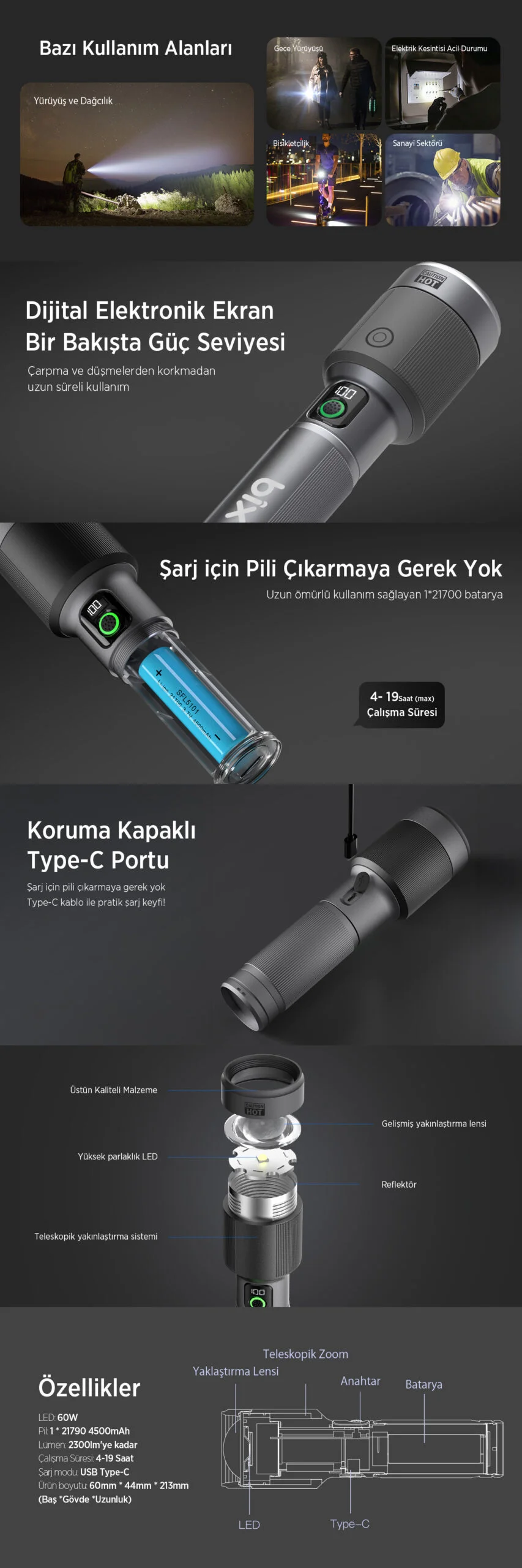Bix BX5101FL 60W LED 850 Metre Uzun Menzilli Şarjlı El Feneri 2300 Lümen Çok Modlu Işıklı Kamp Feneri