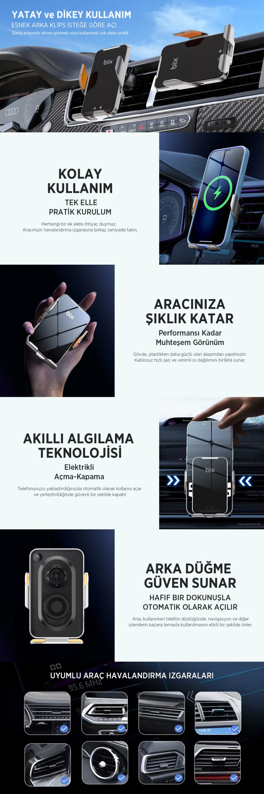 Yatay/dikey tip gibi çoğu havalandırma ızgaralarına uyumlu olarak tasarlanmış BXCH9, hem MagSafe uyumluluğu hem de 15W hızlı şarj desteğiyle sürüş sırasında telefonlarınızı şarj etmek ve sabit tutmak için mükemmel bir çözüm sunar. Kaydırmaz sabitleme mekanizması, yatay havalandırma ızgaralarına kolayca sabitlenerek titreşimlerden ve sallantılardan etkilenmeden akıllı telefonunuzu güvenli bir şekilde tutmaktadır. Ekstra bir alet gerektirmeyen kurulumuyla birkaç saniyede tek elle kolayca monte edilebilir ve kullanılabilir. Arabanızın havalandırma ızgarasına klipsleyin, ardından akıllı telefonunuzu tutucuya yerleştirin, yuva telefon ağırlığı ile güvenli bir şekilde otomatik olarak kilitlenecektir. iPhone, Huawei, Xiaomi, Samsung, gibi markalar için uyumludur.