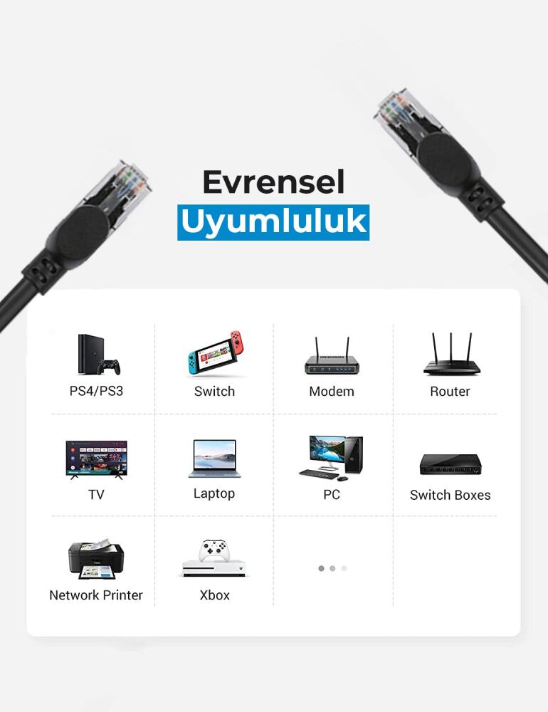 RJ45 Konektörü ile Bix CAT 6A Ethernet kablosu bilgisayarlar, dizüstü bilgisayarlar, modemler, yönlendiriciler, PS5, PS4, PS3, X-Box 360, X-Box One, Switch, ağ anahtarları, ADSL, ağ adaptörleri ve HUB’lar ile uyumludur.