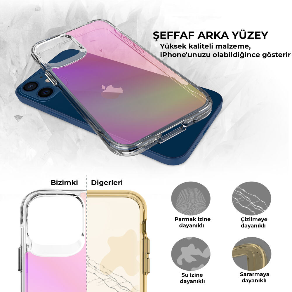 Yüksek kaliteli degrade renk efekti ile telefonunuzun arka yüzeyini sanatsal bir dokunuşla süsler. Zarif ve modern tasarımıyla tarzınıza renk katar.