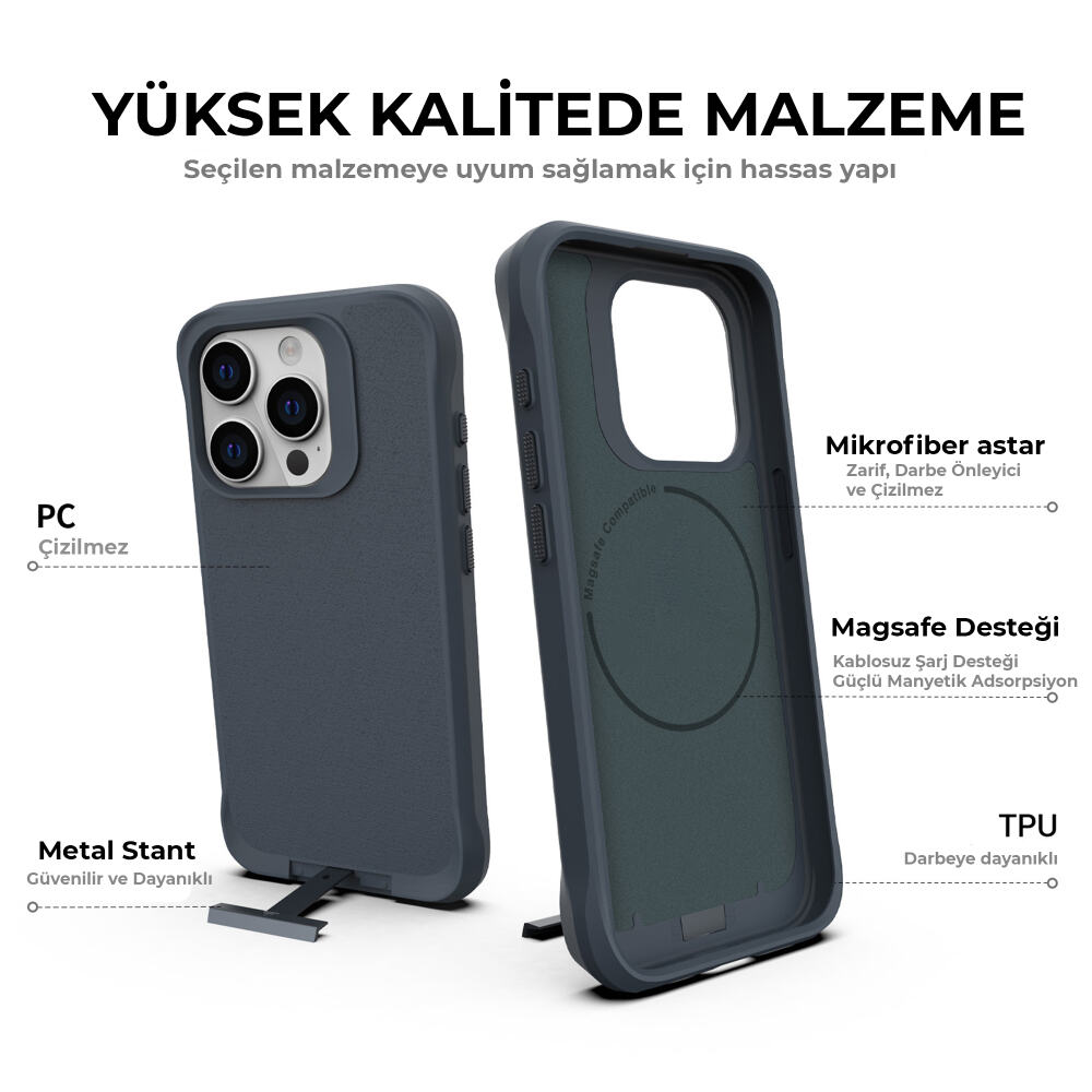 Kılıfın altından çıkan küçük ayak sayesinde telefonunuzu iki farklı açıda kullanabilirsiniz. Yatay (horizon) ve dikey (vertical) pozisyonlarda telefonunuzu stand modunda sabitleyerek video izlerken, görüntülü konuşurken veya çalışırken benzersiz bir konfor deneyimi yaşarsınız.