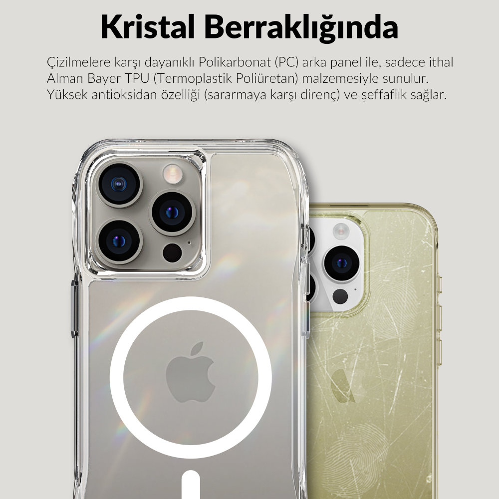 Alman Bayer teknolojisiyle üretilen kristal netliğindeki bu kılıf, telefonunuzun orijinal rengini ve tasarımını olduğu gibi sergiler. Anti-oksidasyon özelliği, zamanla sararmayı önleyerek uzun süre şeffaf bir görünüm sağlar. Modern çizgileriyle estetik bir görünüm sunarken, askeri düzeyde düşme testlerinden başarıyla geçmiştir. Hem tarzınızı tamamlayan hem de telefonunuzu koruyan bir aksesuar olarak öne çıkar.