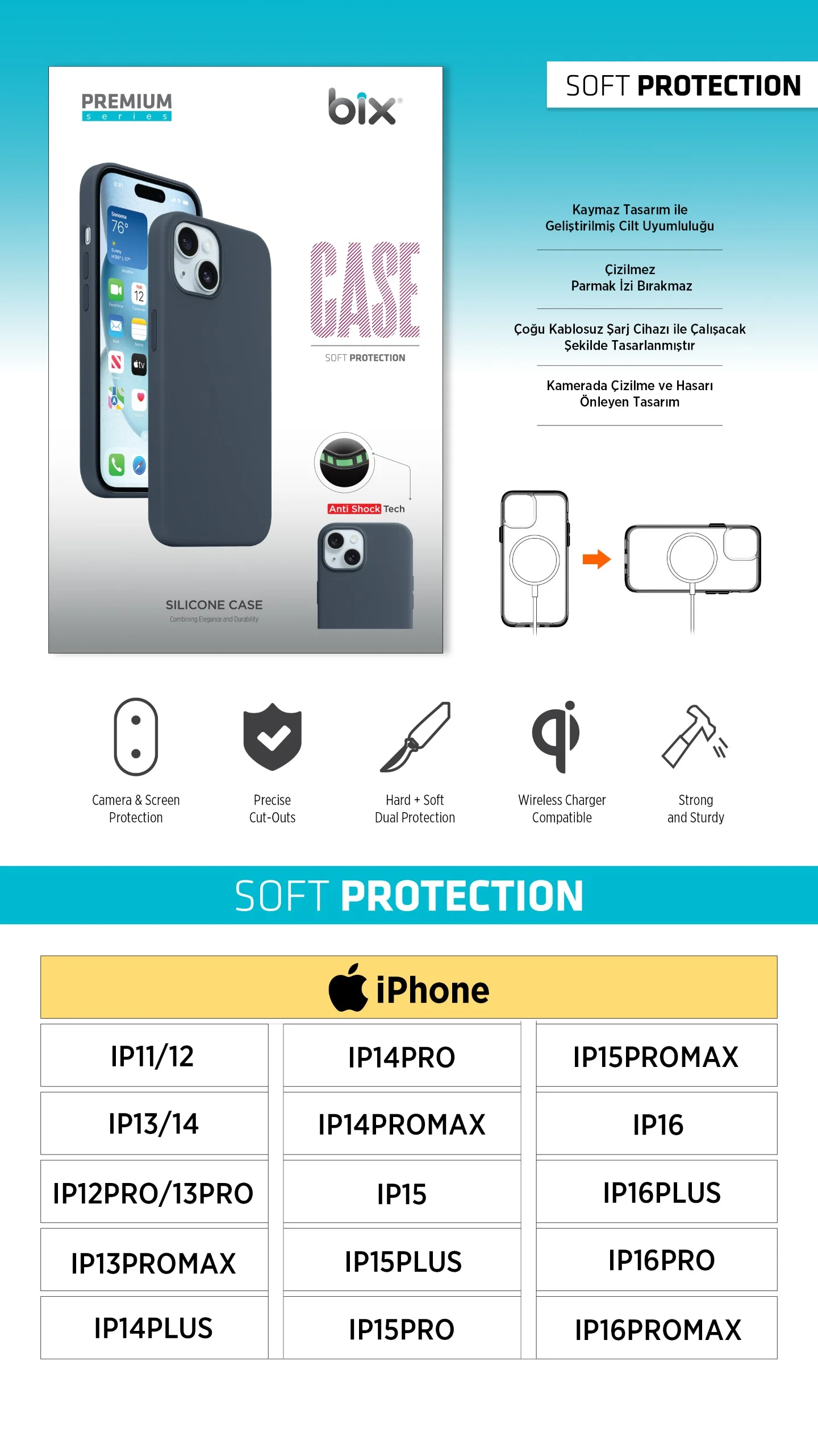 Bix Premium Silikon Kılıf, telefonunuzun güvenliğini ve şıklığını bir arada sunan mükemmel bir aksesuardır. Yüksek kaliteli malzemelerle tasarlanmış olan bu kılıf, her türlü darbe ve çizilmeye karşı üstün koruma sağlar. Kaymaz yapısı sayesinde telefonu elinizden kaydırmaz, ergonomik tasarımı ile mükemmel bir tutuş sunar. Üstelik, kablosuz şarj uyumu sayesinde şarj etme sırasında kılıfı çıkartmanıza gerek kalmaz.