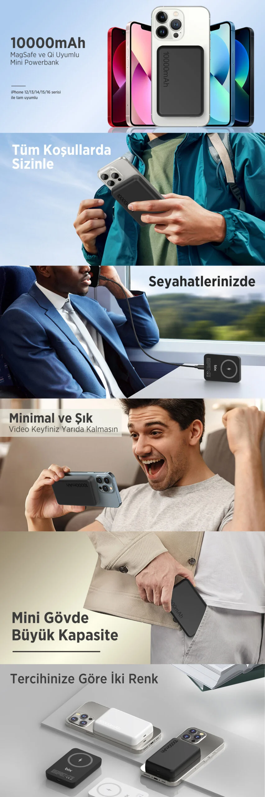 Sadece 105 x 70 x 17 mm boyutlarında ve 207 gram ağırlığında olan bu taşınabilir şarj cihazı, taşıma kolaylığı sağlayarak her an yanınızda olmayı hedefler. Mini ve modern tasarımıyla çantanızda yer kaplamaz, şıklığıyla dikkat çeker. Hafif ve kompakt yapısıyla hem taşınabilirliği ön planda tutar hem de hızlı ve güvenli şarj sunar.