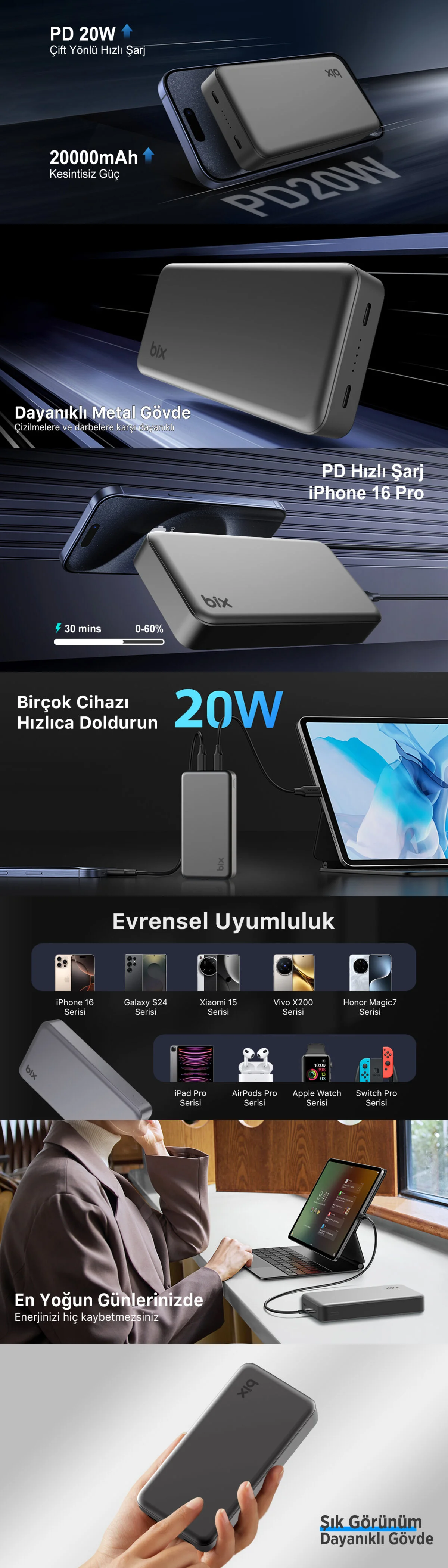 20.000mAh: 20.000mAh kapasitesi sayesinde gün boyu cihazlarınızı birden fazla kez şarj edebilirsiniz. Seyahatlerinizde veya uzun günlerinizde size eşlik edecek ideal bir güç kaynağıdır.