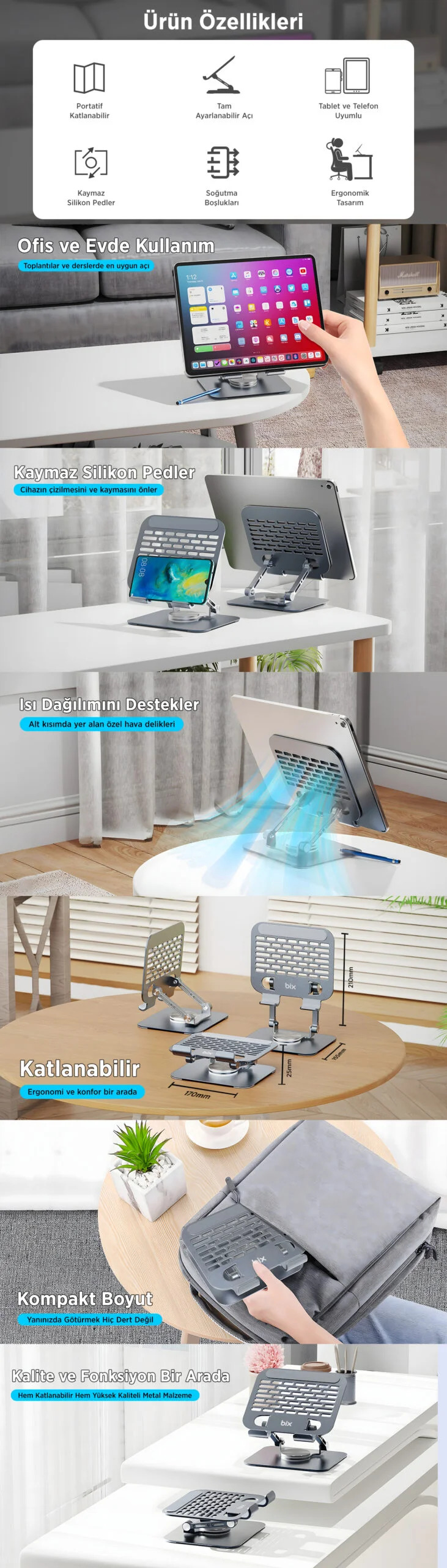 Bix PS01 360° Dönebilen ve Isı Dağılımı Özellikli Katlanabilir Taşınabilir Ergonomik Metal Tablet Standı, hem ev hem de ofis kullanımında konfor ve pratiklik sunuyor. Sağlam metal malzemesi, uzun ömürlü bir kullanım sağlarken, 360° dönebilen yapısı her açıdan mükemmel görüntüleme imkânı tanır. Katlanabilir tasarımı sayesinde kolayca taşınabilir ve yer kaplamaz.