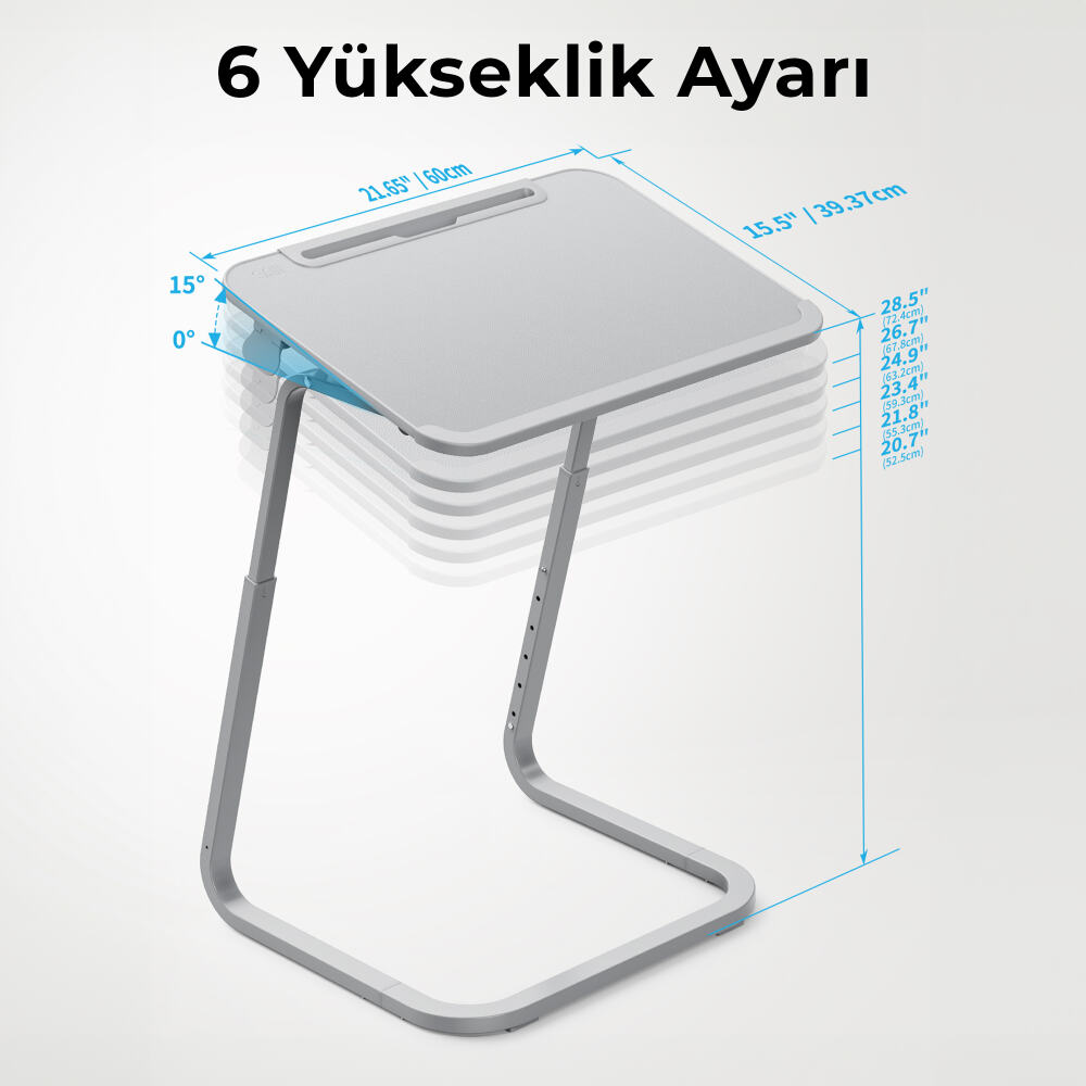524 mm ile 724 mm arasındaki 5 farklı yükseklik seçeneği ve 0° – 15° arasında ayarlanabilen açı sayesinde mükemmel bir çalışma veya dinlenme pozisyonu sunar. İster kanepede yemek yerken, ister yatağınızda çalışırken kullanın, her ortamda ergonomik bir deneyim sağlar.