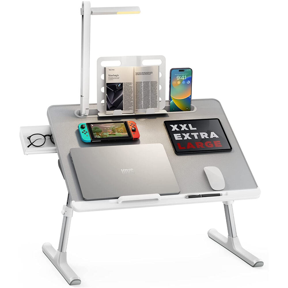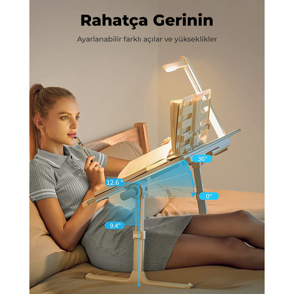 23,6" x 17,7" ekstra geniş diz üstü dizüstü bilgisayar masası ihtiyacınız olan her şeye uyar. Dizüstü bilgisayarınız, ders kitabınız, fareniz ve akıllı telefonunuz bir arada olabilir ve elinizin altındadır. Kanepede, yatakta, komodin olarak ve hatta yerde rahatça çalışabilecek kadar geniştir. Ayaklar, ekstra stabilite ile çoğu yatak masası ayağından %30 daha kalındır.