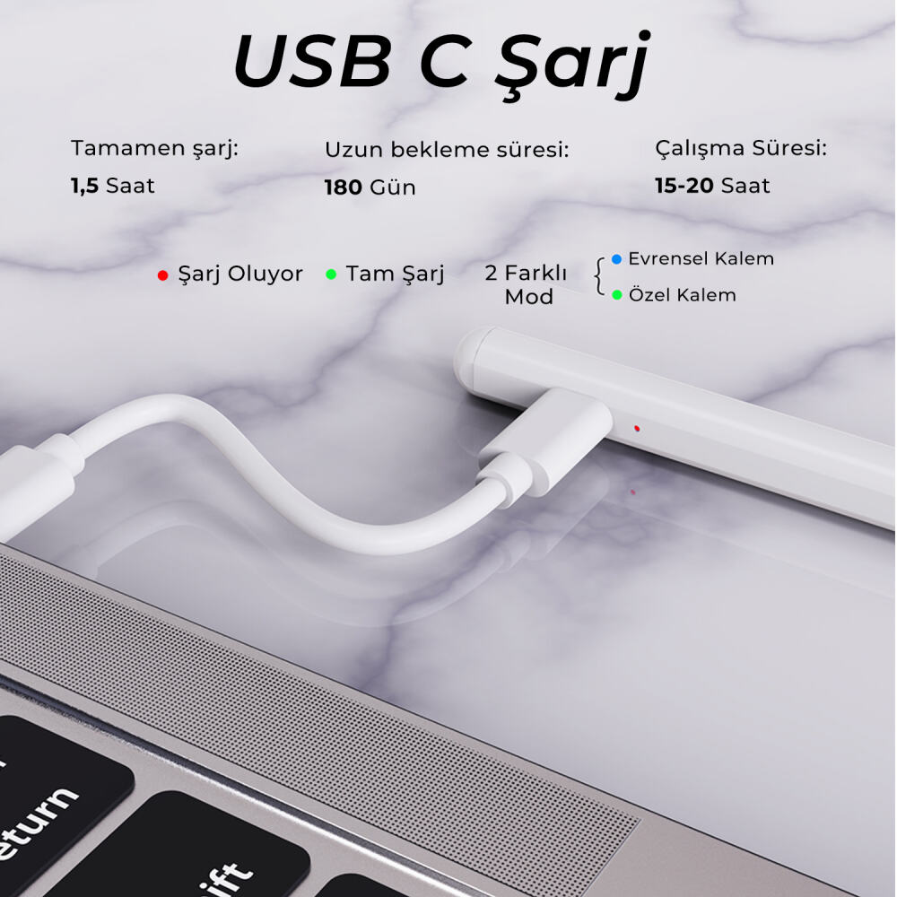 - Uyumluluk: Android telefon ve tabletler, 2018 sonrası iPad modelleri ( iPad 6, iPad Mini 5/6, iPad Air 3/4/5, iPad 7/8/9/10, iPad 1/2/3/4/6), tüm kapasitif dokunmatik ekranlarla uyumlu