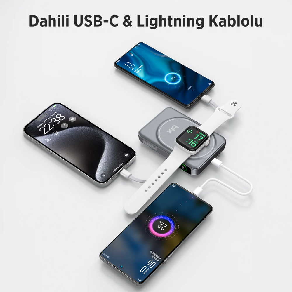 Bu powerbank, hem kablolu hem de kablosuz şarj seçeneklerini bir arada sunar. Dahili Type-C ve Lightning kablolarının yanı sıra, kablosuz şarj desteği ile Qi uyumlu cihazlarınızı 15W’a kadar şarj edebilirsiniz. Dahili Type-C ve Lightning kablolar, her durumda kolaylık sağlar. 15W’a kadar destekleyen kablosuz MagSafe şarj özelliği, cihazlarınızı hızlı ve güvenilir bir şekilde şarj eder. iPhone modelleri başta olmak üzere Qi uyumlu tüm cihazlarla sorunsuz çalışır. Ek olarak, Apple Watch için özel 2W şarj desteği sunarak eksiksiz bir şarj deneyimi sağlar.