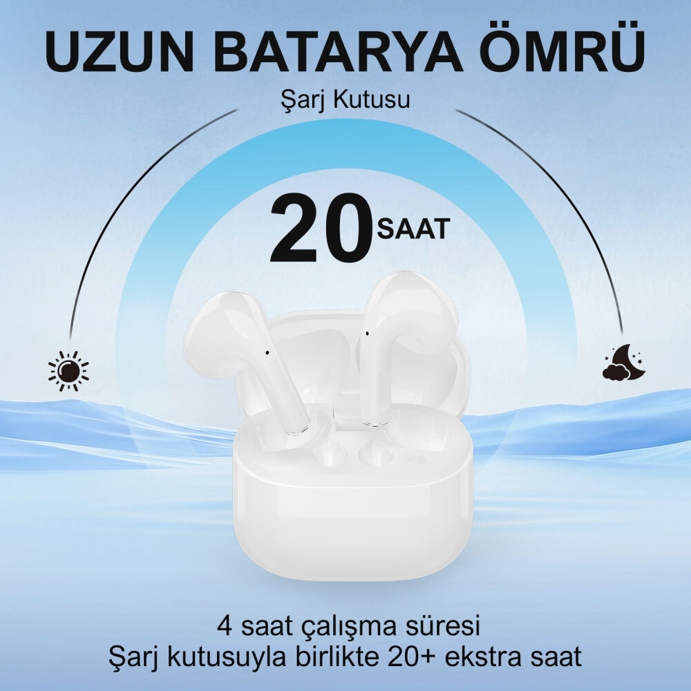 Kesintisiz müzik keyfi sunmak için 20 saate kadar çalma süresi sunar. Type-C şarj kablosunu kullanarak şarj işlemi sağlayabilirsiniz. Kulaklıklar 4 saate yakın bir kullanım sunarken, bu süre kutuyla birlikte kullanımda toplamda 20 saate kadar çıkmaktadır. Ürün konuşma süresi 3-4 saat, şarj olma süresi yaklaşık 1-2 saat aralığındadır.