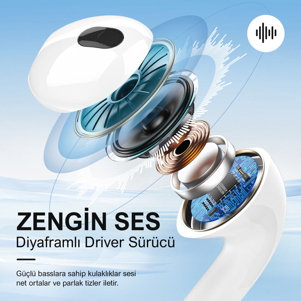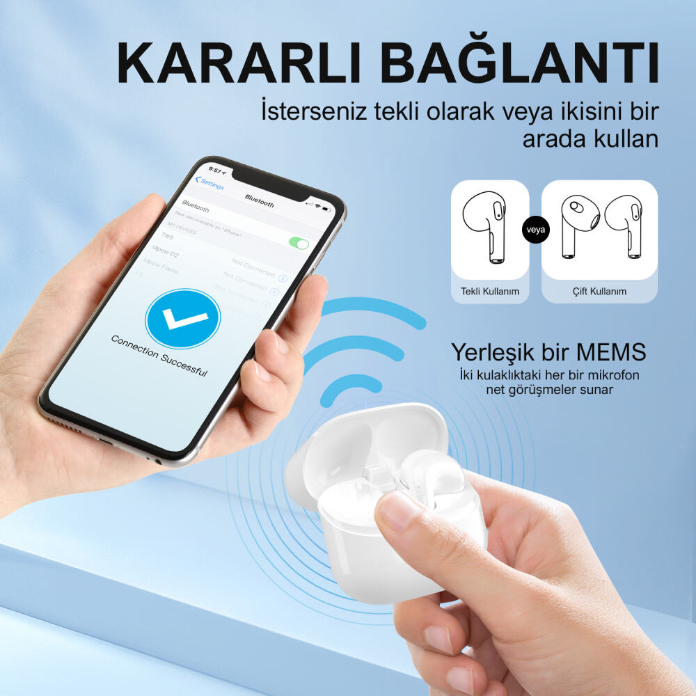 Bluetooth 5.3 teknolojisiyle piyasadaki birçok kablosuz kulaklıktan daha az gecikmeli ve daha kararlı bir bağlantı sunar. Şarj kutusunun içerisindeki kulaklıklar kutu kapağının açılmasıyla eşleştirdiğiniz cihaza otomatik olarak bağlanır. iPhone, iPad, Android cihazlar, tabletler, akıllı telefonlar, bilgisayarlar vb. için kullanımı son derece idealdir.