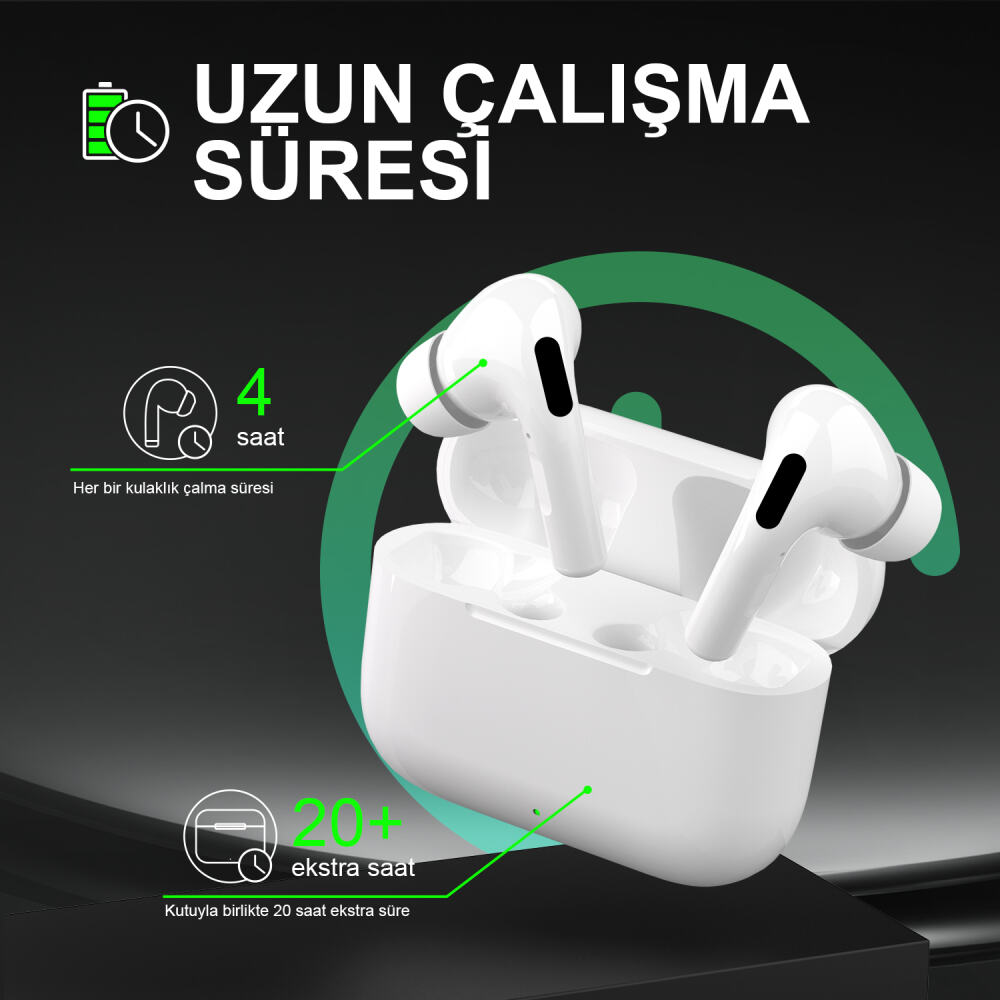 Uzun Pil Ömrü: Şarj kutusu ile toplamda 20 saate kadar çalma süresi sağlar. Her kulaklık 4 saat kullanım sunar ve şarj kutusu ile bu süre 20 saate kadar uzar.