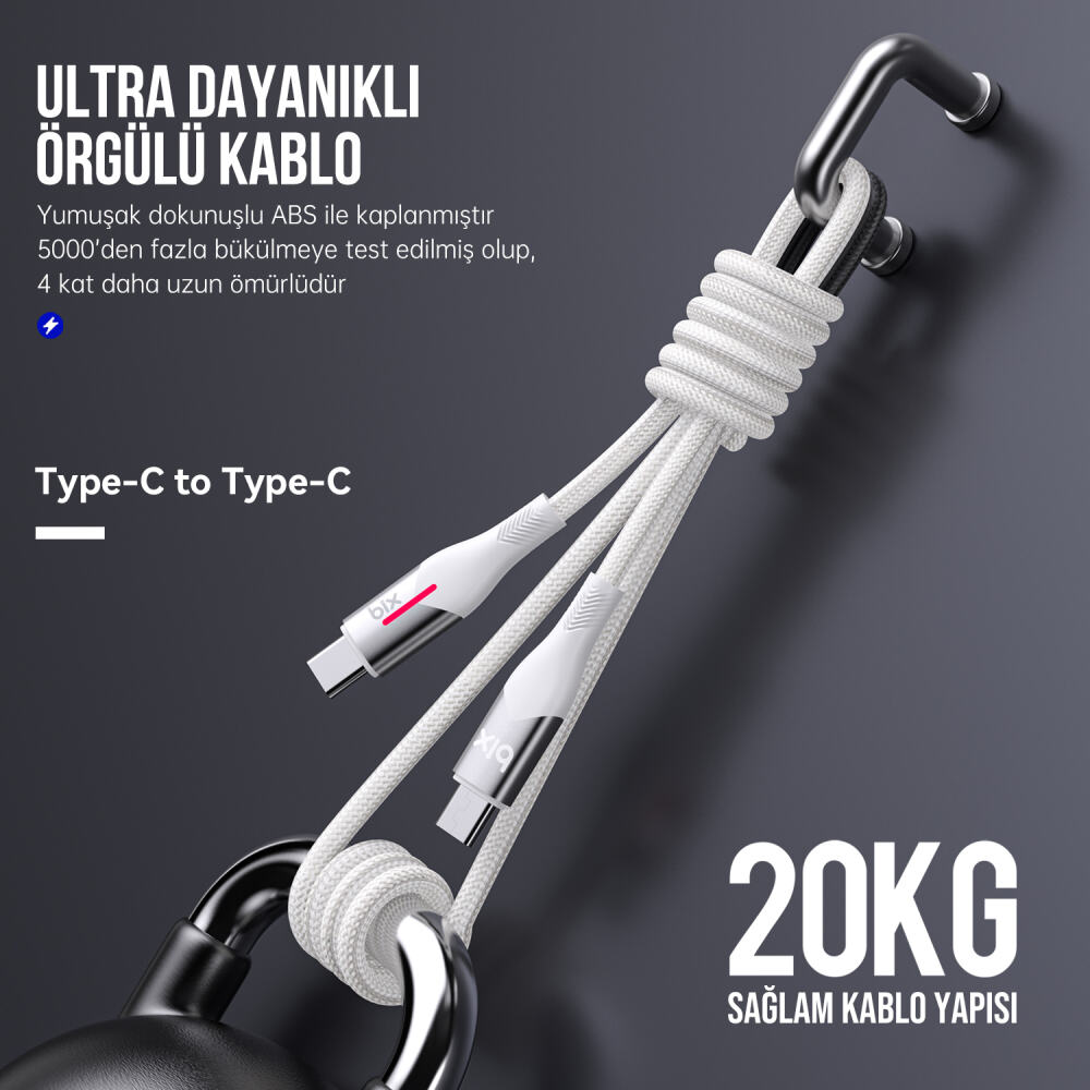 Bix BX05CC, Type-C dizüstü bilgisayarlarınızı, akıllı telefonlarınızı, tabletlerinizi max 20V 3A akımda hızlı şarj eder ve PD 60W / 45W / 30W / 18W hızlı şarjı destekler. Bu hızlara ulaşmanızda kullandığınız şarj aleti ve telefonunuzun modeli çok önemli etkendir. USB-C dizüstü bilgisayarları, tabletleri, cep telefonlarını sadece 30 dakikada %50’ye kadar hızlı bir şekilde şarj eder. Maksimum 60W 20V 3A desteğiyle, 480Mbps yüksek hızlı veri senkronizasyonunu destekler.