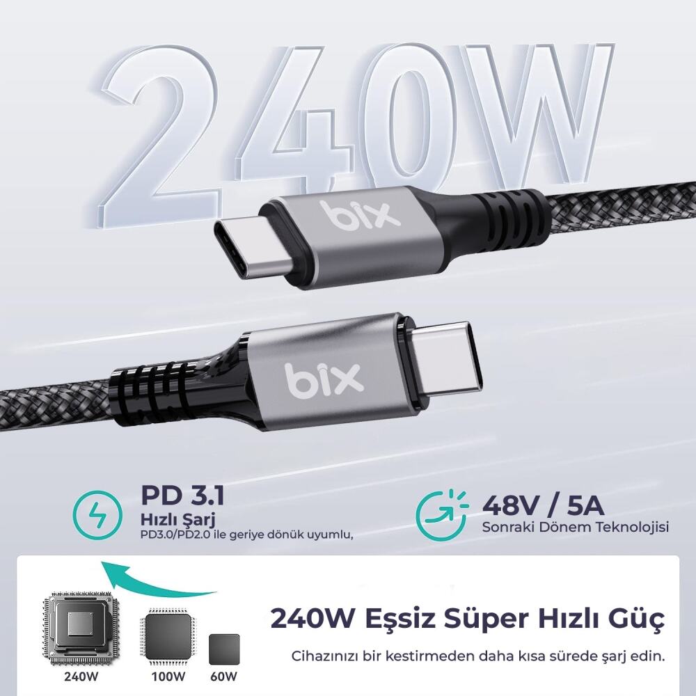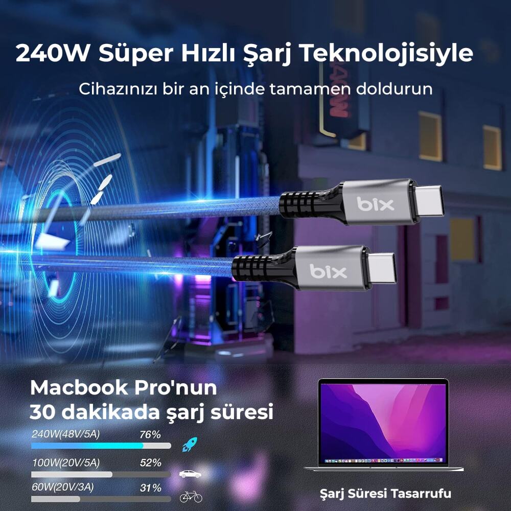 Bix USB4 Thunderbolt 3/4 Uyumlu USB-C IF Sertifikalı 240W 40Gbps 8K 60Hz UHD Şarj, Data ve Görüntü Aktarım Kablosu, çok fonksiyonlu özelliği sayesinde 40Gbps veri aktarımı veya 240W gücünde şarj etmenin haricinde 8K 60Hz çözünürlüğe kadar görüntü aktarımı sağlamaktadır. Görüntü ve şarj fonksiyonlarının yanında 40Gbps ‘e kadar veri aktarımını desteklemesi sayesinde dosya aktarımlarınızı çok kısa sürelerde tamamlamanızı sağlar. Zaman konusunda büyük tasarruf ettirmesinin yanında örgülü ve dayanıklı yapısı ile uzun süre kullanım sunmaktadır.