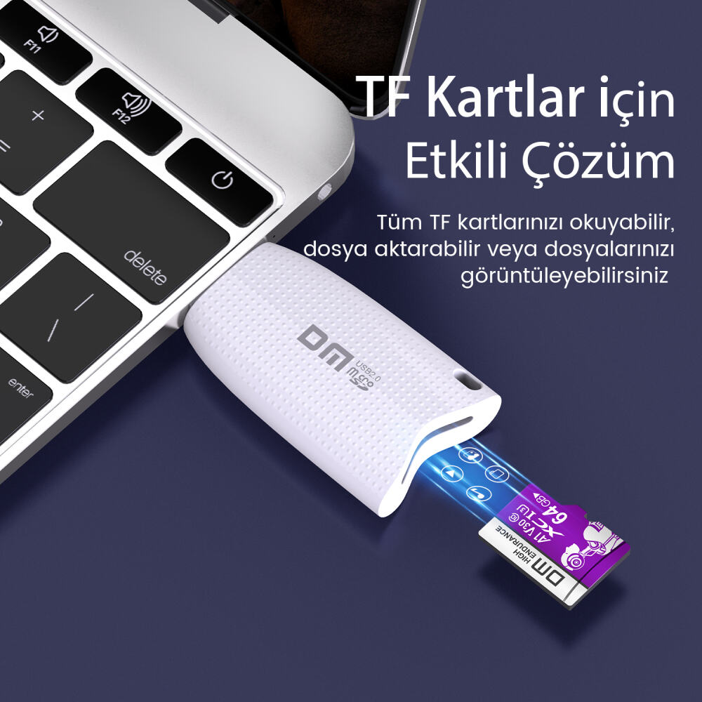 DM CR025 USB 2.0 TF Micro SD Kart Okuyucu Adaptör, USB arayüzünü kullanarak Micro SD(TF) tüm kartları bilgisayarınıza, laptopunuza veya tabletlerinizde görüntüleyebilmenizi sağlar. Kolay kullanımı sayesinde Windows, Mac OS veya Linux gibi işletim sistemlerinde tak-çalıştır şeklinde kullanılabilmektedir. Basit yapısının yanında tasarımsal pratikliği bir arada kullanarak küçük oyuklu bir tasarıma sahiptir. Bu tasarımın yanında kaybolmaları önlemek için bir adet ip bağlama alanı da bulunmaktadır. ABS malzemeden üretilmiş gövde darbelere karşı yüksek dayanıklılık sağlayarak kart okuyucunun zarar görmesini minimum seviyeye indirir.