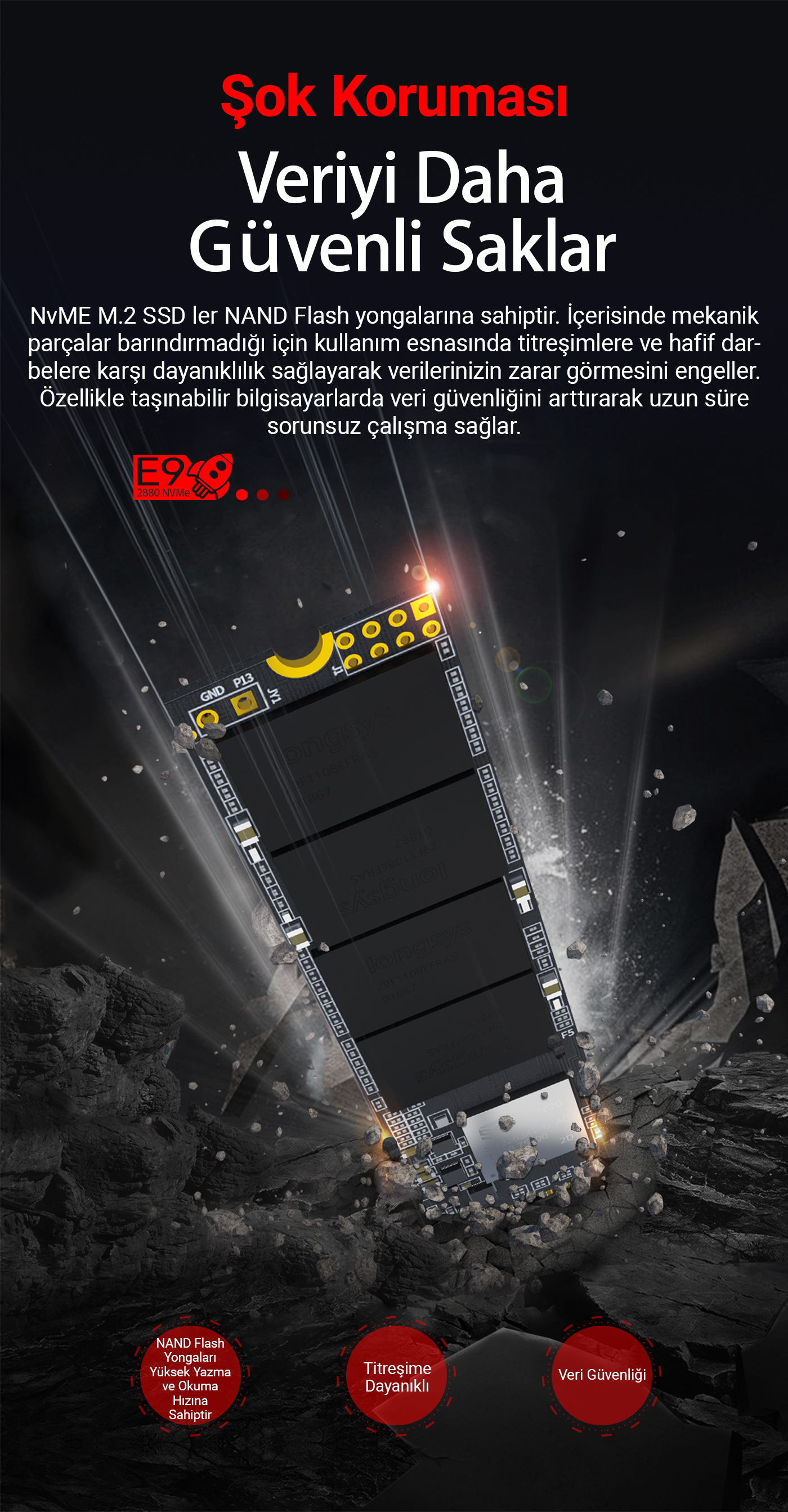 DM E9 1TB PCI-E Gen3x4 M.2 NVMe SSD, günümüz depolama teknolojisinin en üst seviyesi olan PCIe 3.0 teknolojisi sayesinde 2000MB/s okuma ve 1600MB/s yazma hızlarına sahiptir. 4 adet NAND Flash yongası sayesinde verilerinizi güvenli bir şekilde depolayarak daha serin bir çalışma sağlamaktadır. Veri güvenliğinin yanında M.2 SSD ler daha az enerji tüketerek özellikle taşınabilir cihazlarda bataryada daha uzun çalışma süreleri de verebilmektedir. Yüksek okuma yazma hızlarının avantajları ile bilgisayarınızın daha hızlı açılmasını, çizim ve grafik programlarında bilgisayarın donma sorunu olmadan daha hızlı render almasını, oyunlarda bekleme ekranlarının daha çabuk yüklenmesini sağlayarak hem zamanda hem de enerjiden büyük oranda tasarruf edebilirsiniz. DM E9 SSD NVME 1.3 standardını da destekleyerek günümüzdeki birçok M.2 diskten daha verimli ve kararlı çalışabilmektedir. Bu sebeple sadece günlük kullanım için değil RAID olarak da iki veya daha fazla SSD kullanıp verileri yedekli olarak tutabilir ve önemli verilerinizin kaybolma sorununu ortadan kaldırabilirsiniz.