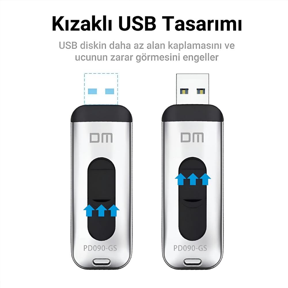 DM PD090 USB 3.0 Alüminyum 32GB Flash Bellek, günümüz USB belleklerinin aksine yüksek hız performansının yanında çinko alaşım bir gövde ile üretilmektedir. Bu sayede darbelere karşı yüksek dayanıklılık sağlayarak verilerinizi en iyi şekilde koruyabilir. Kızaklı yapısı USB çıkış ucunu kullanılmadığı zamanlarda içeri çekerek korur. Yüksek veri aktarım kapasitesi sayesinde 45MB/s yazma ve 150MB/s okuma hızlarına ulaşabilmektedir. Farklı kapasite seçenekleri ile dosyalarınızı boyut sorunu yaşamadan yedekleyebilir veya farklı bir yere aktarırken rahatlıkla yanınızda taşıyabilirsiniz.