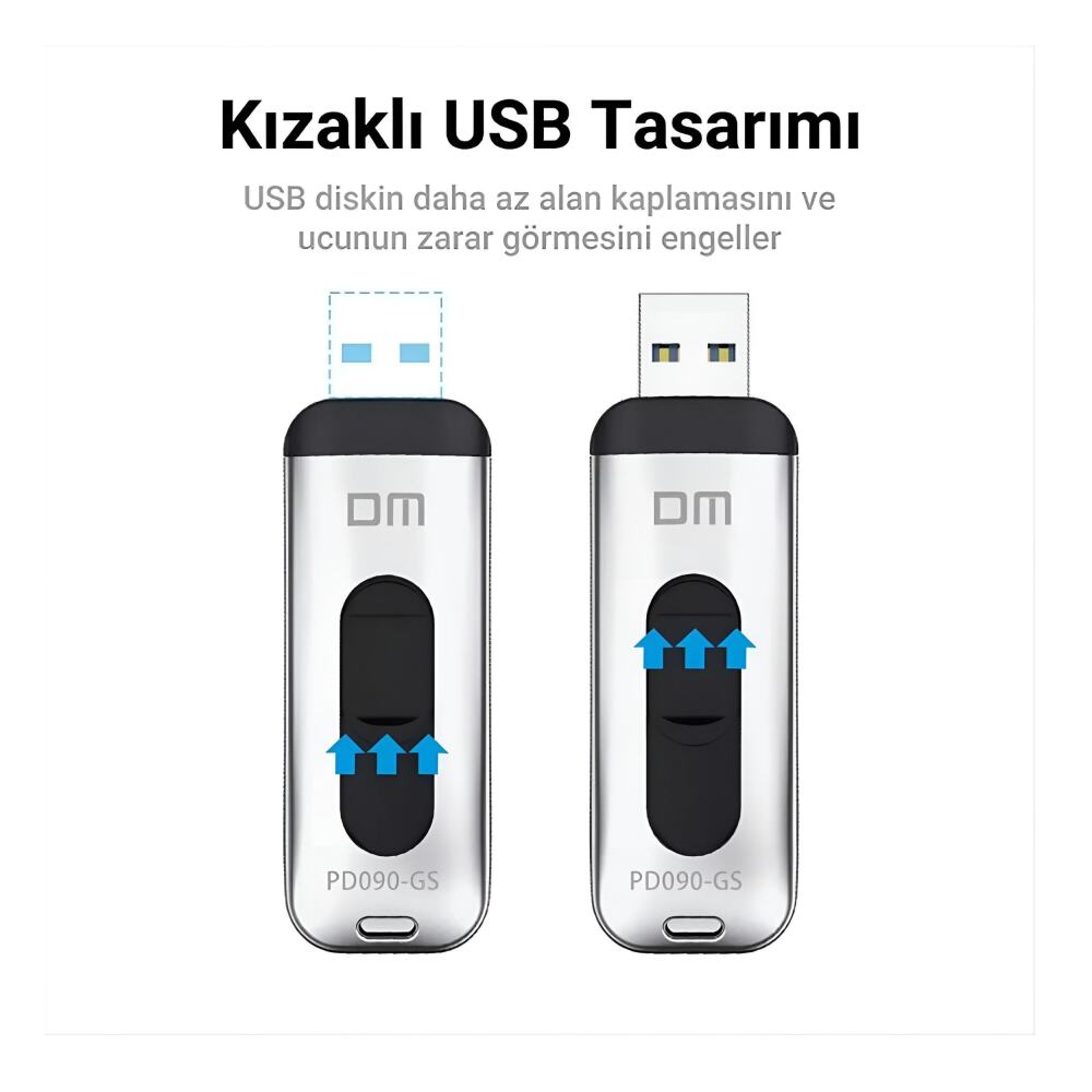 DM PD090 USB 3.0 Alüminyum 64GB Flash Bellek, günümüz USB belleklerinin aksine yüksek hız performansının yanında çinko alaşım bir gövde ile üretilmektedir. Bu sayede darbelere karşı yüksek dayanıklılık sağlayarak verilerinizi en iyi şekilde koruyabilir. Kızaklı yapısı USB çıkış ucunu kullanılmadığı zamanlarda içeri çekerek korur. Yüksek veri aktarım kapasitesi sayesinde 45MB/s yazma ve 150MB/s okuma hızlarına ulaşabilmektedir. Farklı kapasite seçenekleri ile dosyalarınızı boyut sorunu yaşamadan yedekleyebilir veya farklı bir yere aktarırken rahatlıkla yanınızda taşıyabilirsiniz.