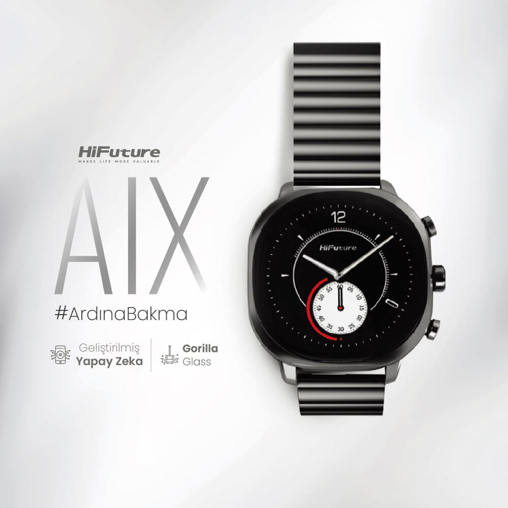 HiFuture AIX, ayrıca hamilelik dönemini kaydetme özelliği, AOD saati, kan oksijeni izleme gibi özelliklere sahiptir. Paslanmaz çelik kasa ve bant malzemeleri ile üretilen ürünün net ağırlığı 130 gramdır ve 46x46x11.2 mm boyutlarına sahiptir.