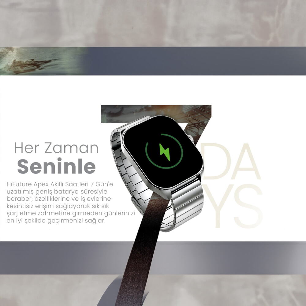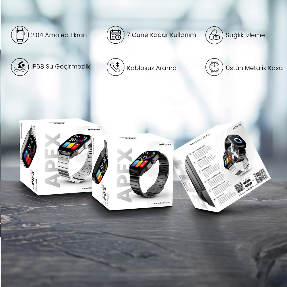 HiFuture APEX, şık ve dayanıklı bir tasarıma sahiptir. Paslanmaz çelik kasası ve 2.04 inç AMOLED ekranı, yüksek çözünürlükte (368*448) renkli görüntüler sunar. Parmak izi tutmaz ekran teknolojisi ile kullanıcıya yüksek hassasiyetli bir dokunmatik deneyim sunar. Bluetooth 5.3 Dual mode özelliği sayesinde hızlı ve güvenilir bağlantı imkanı sunar. Telefon görüşmelerini doğrudan saat üzerinden gerçekleştirebilir, müzik kontrolü yapabilirsiniz. Kalp atış hızını VP60 sensörü ile 24/7 gerçek zamanlı olarak takip eder. Ayrıca, hareketleri STK8321 Yerçekimi Sensörü ile algılar