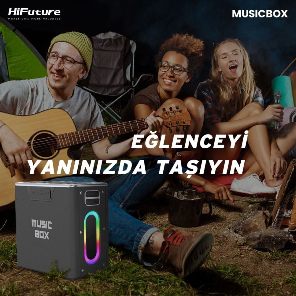 HiFuture MusicBox, taşınabilir karaoke sistemi ve kablosuz hoparlör olarak tasarlanmış bir üründür. Bu ürün, kullanıcılara geniş bir bağlantı yelpazesi ve çeşitli özellikler sunarak müzik keyfini yeni bir seviyeye taşımayı hedefler. Siyah renk seçeneğiyle şık ve modern bir tasarıma sahip olan HiFuture MusicBox, güçlü ses performansı, taşınabilirlik ve çok yönlülük özellikleriyle dikkat çeker.
