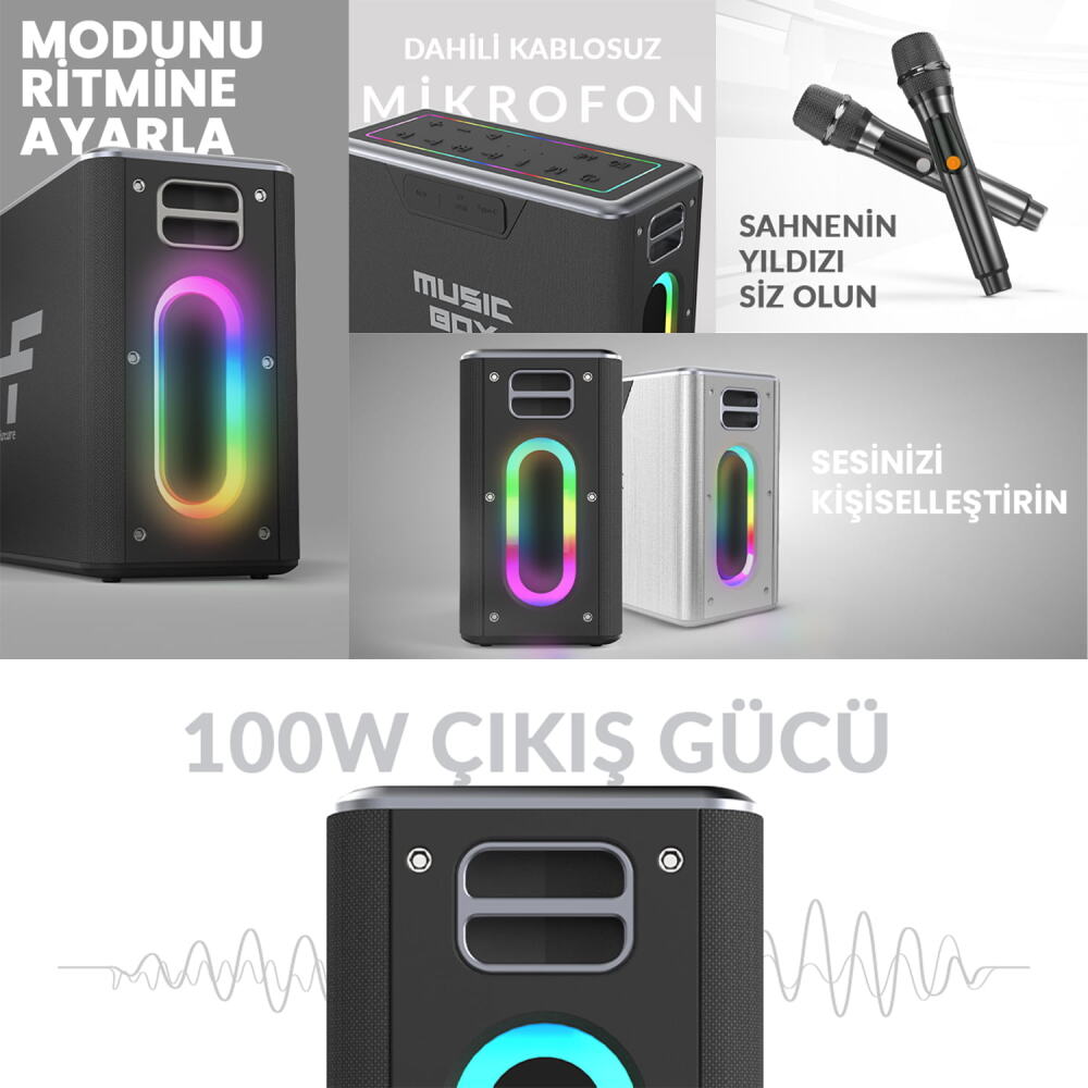 HiFuture MusicBox 2 Mikrofonlu TWS Karaoke Kablosuz 100W Hoparlör RGB Aydınlatmalı Siyah