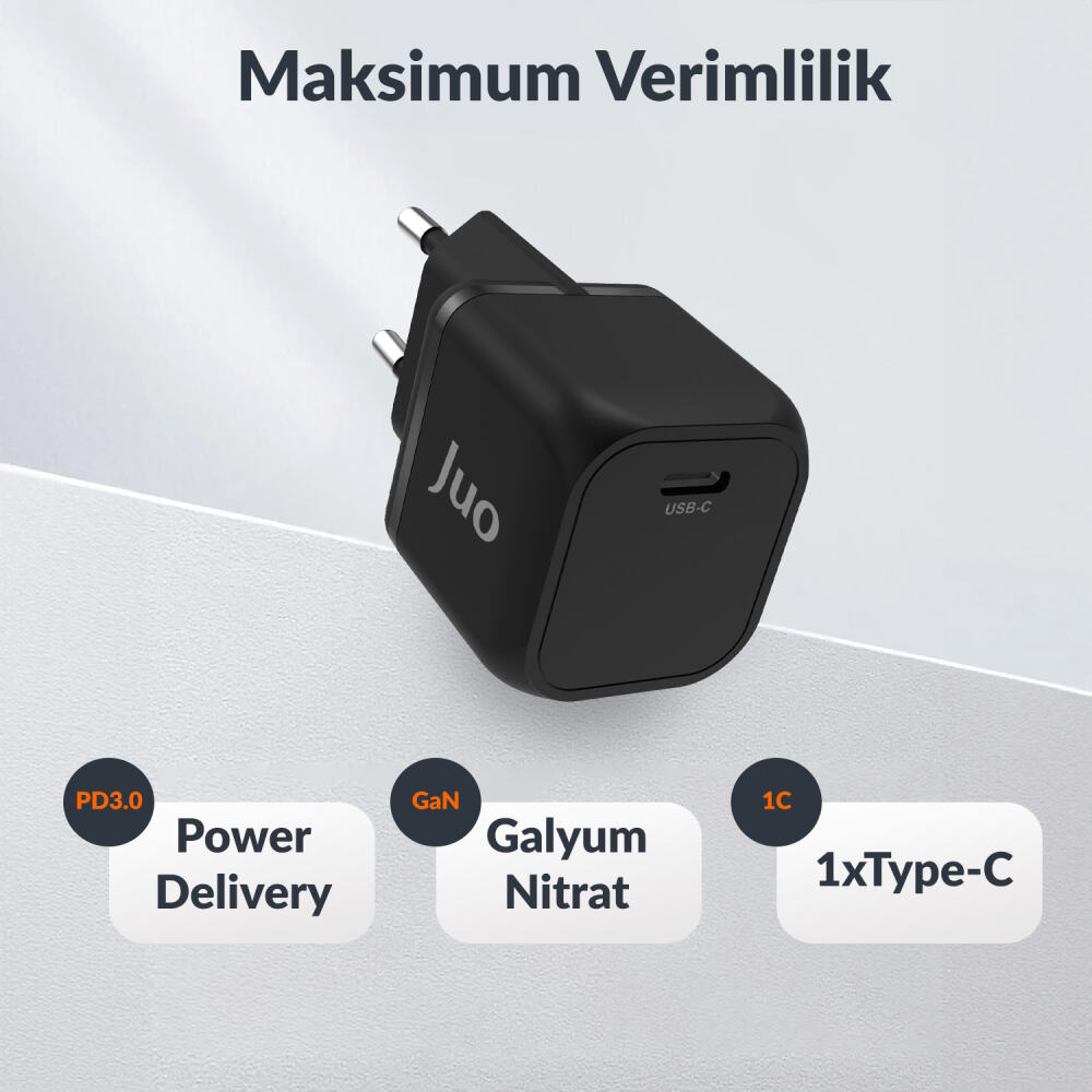 - 1 x Juo 20W GaN USB-C Şarj Aleti iPhone & iPad & Android Uyumlu PD QC4.0 Type-C Hızlı Şarj Cihazı Siyah