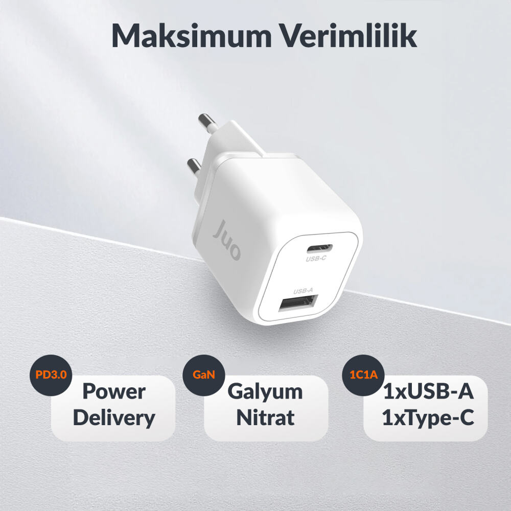 Juo G351C1A 35W GaN USB-C + USB-A Şarj Aleti iPhone & iPad & Android Uyumlu Samsung PPS PD QC4.0 Type-C Hızlı Şarj Cihazı desteklediği protokoller sayesinde bir çok cihaz ile uyumluluk sağlamaktadır. 35W çıkış gücü ile uyumlu tüm telefon, tablet gibi cihazlarınızda güvenle kullanabilirsiniz.