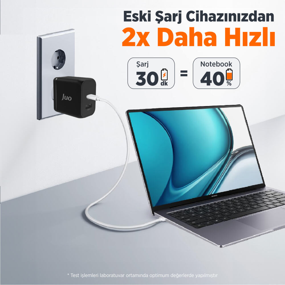 GaN (Galyum nitrid), şarj aletleri ve güç adaptörlerinde giderek daha fazla kullanılan yenilikçi bir yarı iletken kristal malzemedir. Geleneksel silikon bazlı şarj cihazlarına göre yüksek performans sergilemektedir. Mükemmel iletkenliğinin yanında yüksek sıcaklıklara karşı dirençlidir. GaN teknolojisine sahip şarj cihazlarının yüksek frekansları nedeniyle, daha az alan gerektirir. GaN teknolojisinden güç alan Juo 45W G451C1A şarj adaptörü silikon bazlı şarj cihazlarına kıyasla minimal yapıda daha yüksek Watt değerlerine sahiptir.