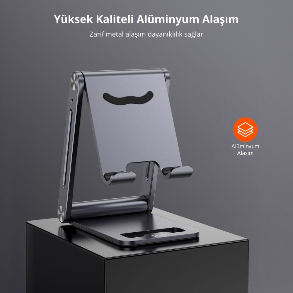 Juo metal masaüstü telefon standı, yüksek kaliteli alüminyum alaşımdan üretilmiş dayanıklı ve şık bir metal telefon tutacağıdır. Ergonomik tasarımı ve kaymaz silikon pedleriyle tüm akıllı telefonlar için ideal bir masaüstü aksesuarıdır. Premium alüminyum telefon tutucu, dayanıklı metal yapısı ve özel kaymaz silikon pedleriyle telefonunuzu güvenle tutar. Masaüstü telefon tutacağı, yüksek kaliteli malzemesiyle uzun ömürlü kullanım sağlar.
