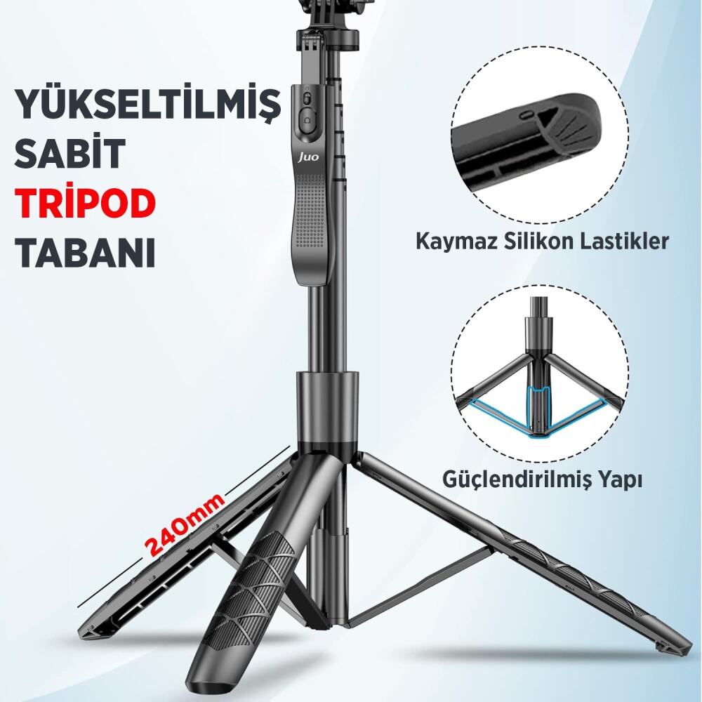Profesyonel fotoğraf ve video çekimleri için tasarlanan Juo uzun selfie çubuğu tripod, yüksek kaliteli alüminyum alaşımlı yapısı ve 1.54 metre uzatılabilir özelliği ile fotoğrafçılık tutkunlarının vazgeçilmez aksesuarı olmaya aday. Uzaktan kumandalı Selfie Stick özelliği ile mükemmel grup fotoğrafları ve profesyonel çekimler yapabilirsiniz.