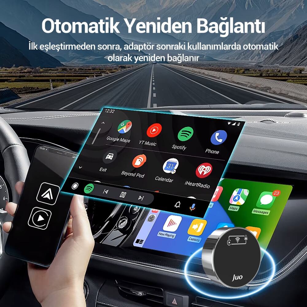 Juo carplay usb adaptör ile aracınızda bulunan kablolu CarPlay ve Android Auto sistemini android auto adaptör sayesinde kablosuz kullanmanın keyfini yaşayın. Bu kabloludan kablosuza çevirici, araç multimedya sisteminize herhangi bir değişiklik yapmadan carplay & android auto adapter özelliklerini güvenli şekilde sunar.