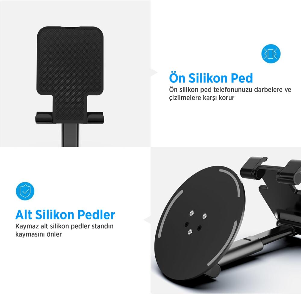 Masaüstü telefon tutucu, ABS plastik ve silikon malzemeden üretilmiş olup, soğuk haddelenmiş demir plaka tabanı sayesinde maksimum stabilite sağlar. Kaymaz taban özelliği ile güvenli kullanım sunar.