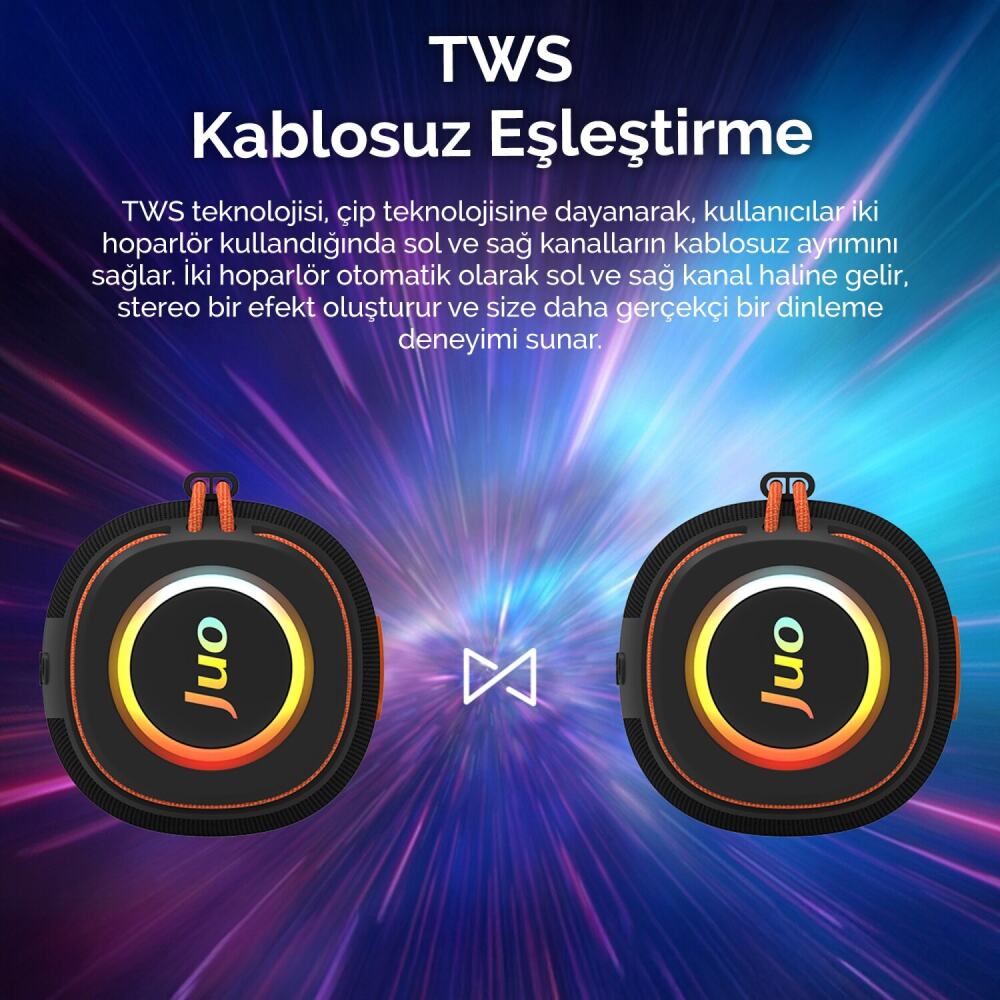 Jerry JL5.3 çipset ile donatılan bu wireless speaker, Bluetooth 5.3 teknolojisi sayesinde 10-15 metre mesafede stabil bağlantı sağlar. TWS equipment interconnection özelliği ile iki hoparlörü birbirine bağlayarak stereo ses deneyimi yaşayabilirsiniz. Bu yüksek sesli Bluetooth hoparlör, BT, USB, TF, AUX gibi multiple modes destekler.