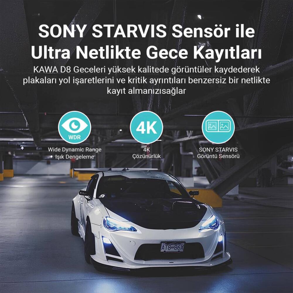 Kawa D8 2 Kameralı Ön / Arka 4K + 1080P Sony Starvis Sensörlü Türkçe Wi-Fi GPS'li Araç Kamerası, sizin ve aracınızın güvenliği için yüksek teknoloji ve materyallerden tasarlanmış bir araç kamerasıdır. D8 içerisinde bulunan SONY STARVIS görüntü sensörü ile ön kamera 4K çözünürlükte video kaydı alır. WDR teknolojisi gelen ışığı en iyi şekilde dengeleyerek karanlık ve çok aydınlık alanları daha net şekilde kaydeder. Sahip olduğu 7 katlı cam lens, 150° görüş açısı ve F1.8 diyafram açıklığı, geniş bir görüş açısı sunarak net gece kaydı yapmanızı sağlar. 1080P çözünürlüğe sahip arka kamera 135° görüş açısına sahiptir. Dahili mikrofonu sayesinde video kayıtlarınızda isteğe bağlı olarak ses kaydı da alabilirsiniz. LCD ekranı ile ön ve arka kameranın çekim açılarını görebilir ve kamera ayarlarını yapabilirsiniz. Dahili GPS sayesinde konum bilgileriniz kayıt alınan video içine gömülür. Dahili WiFi sayesinde telefon ile kameraya bağlanıp videoları izleyebilir kamera ayarlarını yapabilirsiniz. Sert plastikten üretilen dış kasanın üzerinde bulunan hava kanalları kameranın aşırı ısınmasını önler.