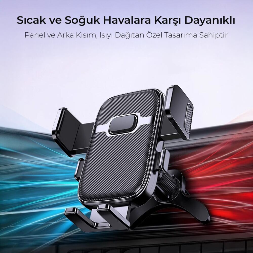 Özel tasarım kilitleme mekanizması ve silikon tabanlı telefon tutucu yapısı sayesinde cihazınızı güvenle sabitler.