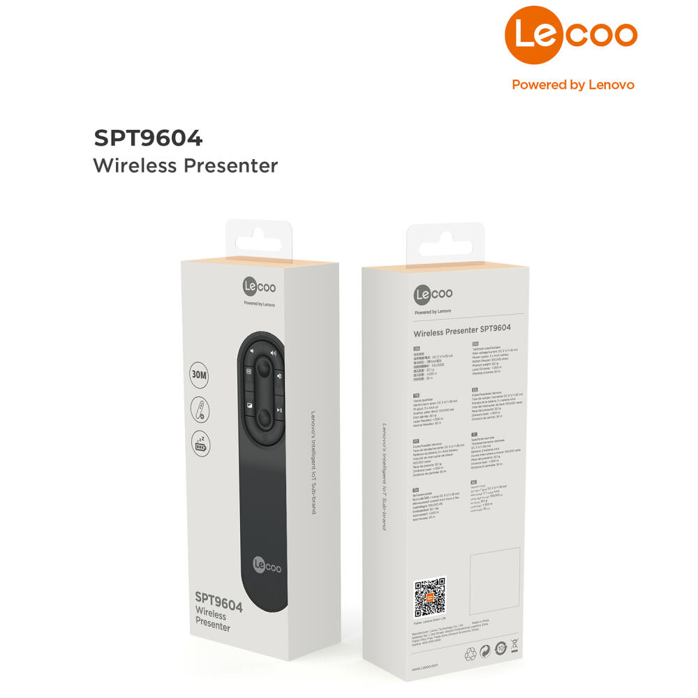 Lenovo Lecoo SPT9604 2.4 Ghz Lazer Presenter Kablosuz Sunum Kumandası, 200 metreye kadar lazer menzili ve 30 metre kontrol mesafesi, ergonomik tasarımı ve rahat silikon tuşlarının yanı sıra standart bir lazere sahip kablosuz bir sunum cihazıdır. Hiçbir yazılım yüklemeden, kumanda içerisinden çıkan USB alıcıyı bir USB bağlantı noktasına takarak kullanabilirsiniz. Ayrıca sunum bittiğinde USB alıcıyı tekrar kumanda içerisinde muhafaza edebilirsiniz. Sunumlarınızda bilgisayarınızın klavyelerine dokunmadan sayfayı ses açıp kapatma, ses seviyesini yükseltme, durdurup tekrar oynatma veya kapatma, aşağı-yukarı gibi işlemleri uzaktan kumanda üzerinden rahatlıkla yapabilirsiniz. Kompakt boyutu sayesinde saklaması ve yanınızda taşıması oldukça kolaydır. Bu kablosuz sunum cihazı aynı zamanda güçlü ve dayanıklı olan kaliteli PVC + ABS malzemeden yapılmıştır. Bu kumanda iki adet pil ile çalışmaktadır ve piller paket içerisine dahildir.