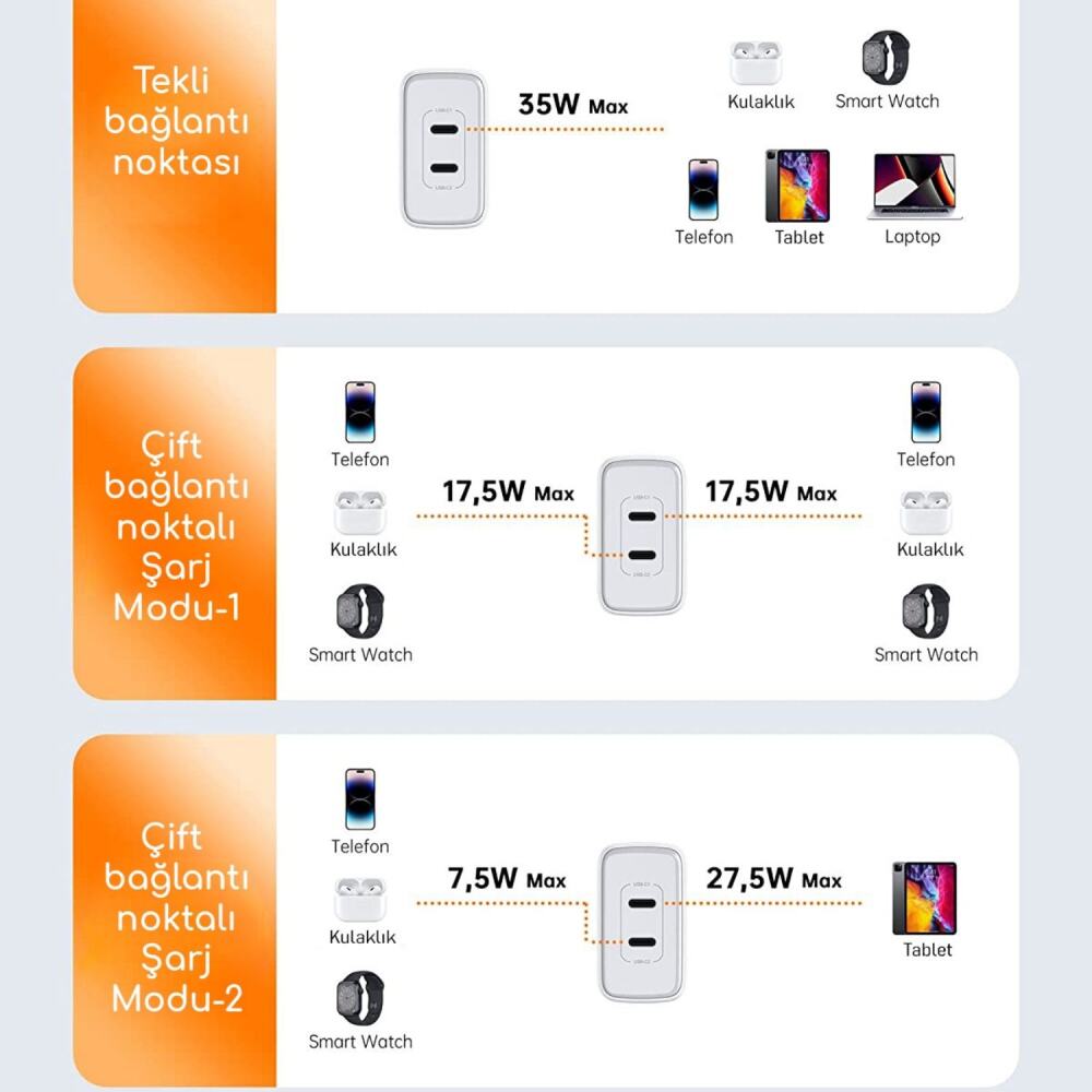 Sadece tek bir USB-C portundan şarj işlemi gerçekleştiğinde maksimum şarj gücü 35 W'tır. Aynı anda iki cihaz bağlandığında şarj cihazı gücü max. 17.5W-17.5W veya 27.5W–7.5W olarak dağıtacaktır.