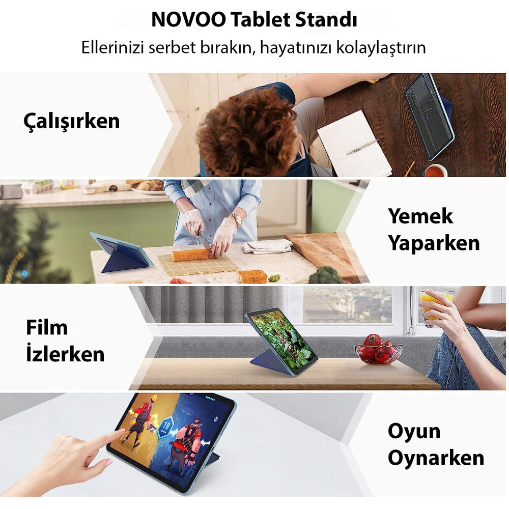 Novoo RT10 Açı Ayarlı Katlanabilir 10" inç ve Üzeri için Ultra Slim Tablet Standı, origamiden ilham alan bir tasarıma sahiptir ve basit katlama çizgileri, cihazı istediğiniz açıda serbestçe döndürmenizi sağlar. İster yemek tarifi izleyin, film izleyin, ister video oynatın veya kaydedin. Bu tablet standı daha rahat bir deneyim için ellerinizi serbest bırakır. Ofisler, mutfaklar, oturma odaları, dış mekanlar ve daha fazlası için gerekli bir masaüstü aksesuarıdır.