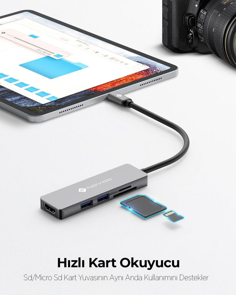 Novoo Type-C to 2*USB-A 3.0 4K HDMI TF SD Kart Okuyucu Dönüştürücü, Type-C girişli bir dizüstü bilgisayarı 5 farklı bağlantı noktasına dönüştürür. Bu bağlantılar 1 adet 4K destekli HDMI, 2 adet USB-A 3.0 ve SD/TF kart girişleridir. Ofis işleri, konferans, ev ofis, sınıf, oyun veya film izlemek için çok uygundur ve tak-çalıştır özelliğine sahiptir. Kart okuyucu özelliği sayesinde Micro SD ve SD kart okuyucuları sayesinde bellek kartlarındaki dosyaları görüntüleyebilirsiniz. SD/TF yuvası, SD/micro SD evrensel hafıza kartlarındaki dosyalara kolay erişim sağlar ve 512 GB'a kadar kapasiteyi destekler. FCC, CE ve RoHS, UKCA sertifikalıdır.