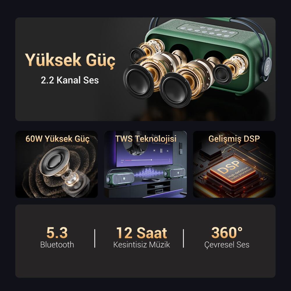 NOWGO C2, yüksek performanslı bluetooth speaker teknolojisi ile evde ve dış mekanlarda profesyonel karaoke sistemi deneyimi sunar. 60W güçlü çıkış performansına sahip bu mikrofonlu bluetooth hoparlör, retro tasarımı ve 20 saate kadar kesintisiz kullanım imkanı ile her ortamda müzik keyfini en üst seviyeye taşır.