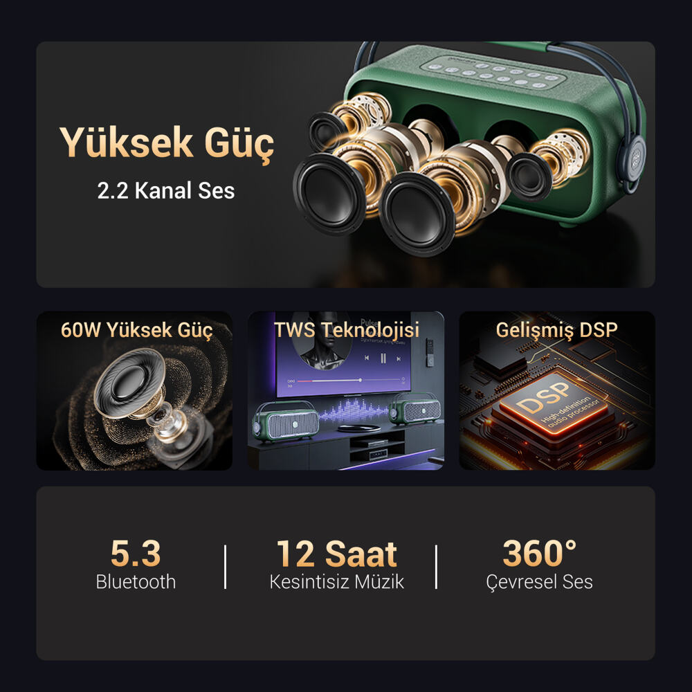 2x3.5 inç orta düşük frekans sürücüsü, 2x1.55 inç orta yüksek frekans sürücüsü ve 2x3.5 inç pasif radyatör ile donatılan bu bluetooth hoparlör, tizleri berrak, midleri dengeli, basları güçlü ve titreşimli şekilde aktarır. Ahşap pasif radyatör sayesinde daha doğal ve zengin ses deneyimi elde edersiniz.