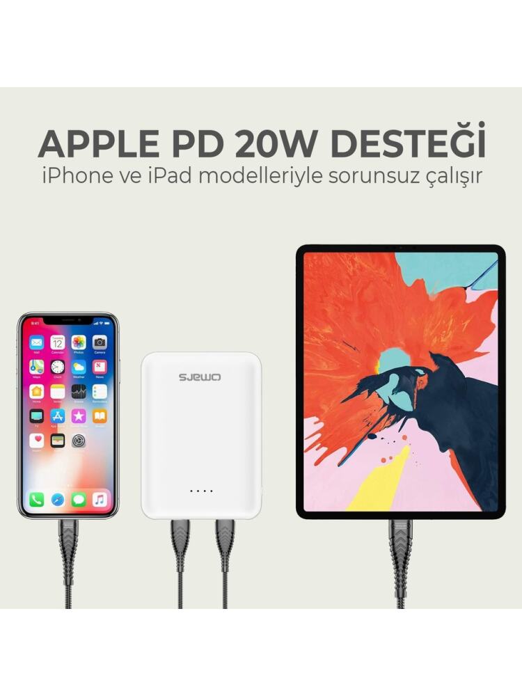 Omars 10000mAh Type-C ve USB Çift Çıkışlı PD 20W Mini Powerbank, mini yapısı ve bir kart boyutunda olması sebebiyle sürekli yanınızda taşıyabileceğiniz powerbank modelidir. Üzerinde 1 adet USB çıkışı, 1 adet Micro USB girişi ve 1 adet Type-C giriş/çıkış bağlantı noktaları sayesinde aynı anda 2 cihazı rahatlıkla şarj edebilirsiniz. Kısa devre, aşırı ısınma, yüksek voltaj, aşırı gerilim ve aşırı şarj gibi durumlara karşı cihazlarınız üzerinde koruma sağlar. Bu yüksek kapasiteli ve küçük boyutlu powerbank cihazının güvenlik sertifikalı li-polimer pilleri en yüksek seviyede güvenlik ve verimli kullanım sağlar. Üzerinde bulunan led göstergesi ile powerbank cihazınızın şarj durumunu kontrol edebilirsiniz.Güvenli sertifikalı Li-polimer pillerimiz en yüksek güvenlik ve kalite standartlarına uygundur. Tabletler, bluetooth kulaklıklar ve başta iPhone, Samsung, Huawei olmak üzere piyasadaki tüm markaların akıllı telefonlarıyla uyumludur. Apple PD 20W hızlı şarj protokolünü, QC18W ve FCP 18W hızlı şarjları desteklemektedir.