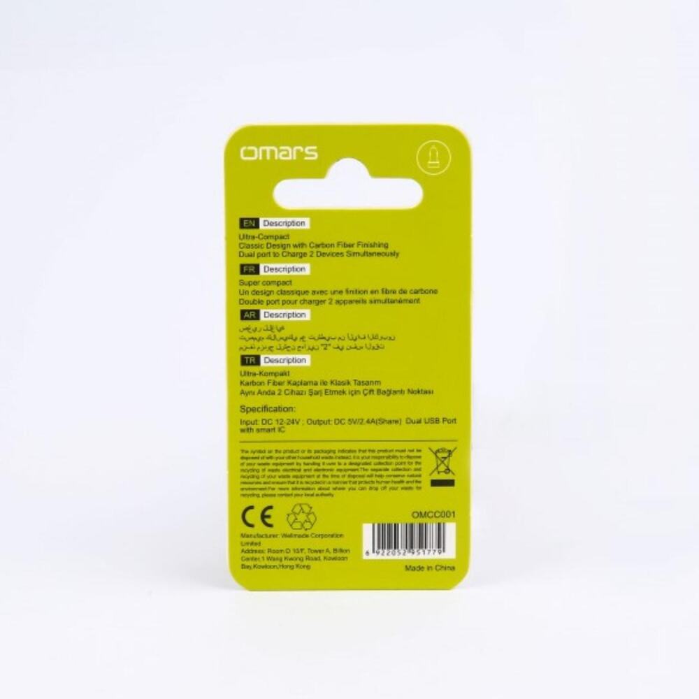Omars 2.4A Çift USB Çıkışlı Araç içi Şarj Cihazı aracınızın araç çakmaklık çıkışı üzerinden rahat biçimde akıllı cihazlarınızı şarj edebilmenize olanak tanır. Aynı anda iki farklı USB portu üzerinden iki farklı cihazı şarj edebilirsiniz. Ürün 5V/2.4A güç desteği sunarken karbon fiber kaplamalı klasik tasarımı güvenli şarj işleminin yanında şıklığı da aracınıza taşır. Şarj güvenliği konusunda yüksek verimlilik için kısa devre, yüksek akım, yüksek voltaj, düşük voltaj ve yüksek sıcaklık durumlarında enerjiyi keserek cihazı ve kendini korumaya almaktadır.