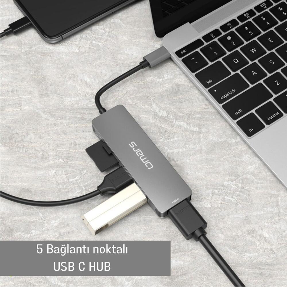 - 1 x Omars 5 Port Type-C 4K HDMI Video Transferi 5Gbps USB 3.1 SD/TF Kart Uyumlu Hub Çoklayıcı Adaptör