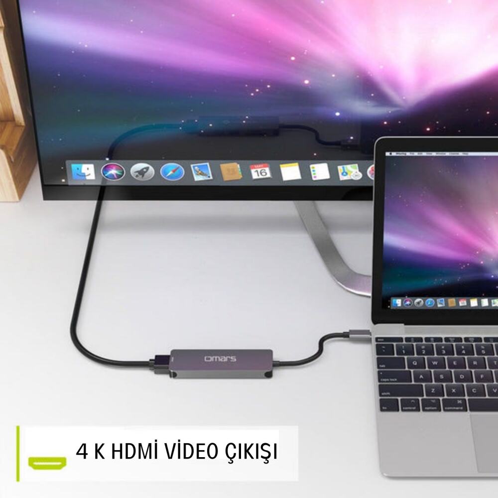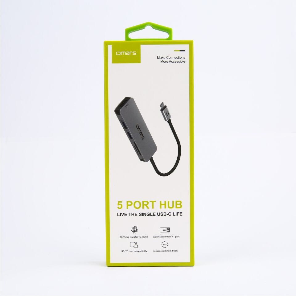 Omars 5 Port Type-C 4K HDMI Video Transferi 5Gbps USB 3.1 SD/TF Kart Uyumlu Hub Çoklayıcı Adaptör, Type-C girişli bir dizüstü bilgisayarı 5 farklı bağlantı noktasına dönüştürür. Bu bağlantılar 1 adet 4K destekli HDMI, 2 adet USB-A 3.0, ve SD/TF kart girişleridir. Ofis işleri, konferans, ev ofis, sınıf, oyun veya film izlemek için çok uygundur ve tak-çalıştır özelliğine sahiptir. Kart okuyucu özelliği sayesinde Micro SD ve SD kart okuyucuları sayesinde bellek kartlarındaki dosyaları görüntüleyebilirsiniz. SD/TF yuvası, SD/micro SD evrensel hafıza kartlarındaki dosyalara kolay erişim sağlar. FCC, CE ve RoHS, UKCA sertifikalıdır. Kullanmadan önce lütfen dizüstü bilgisayarınızın Type-C bağlantı noktasının Thunderbolt 3/Thunderbolt DP alt modunu desteklediğinden emin olun.